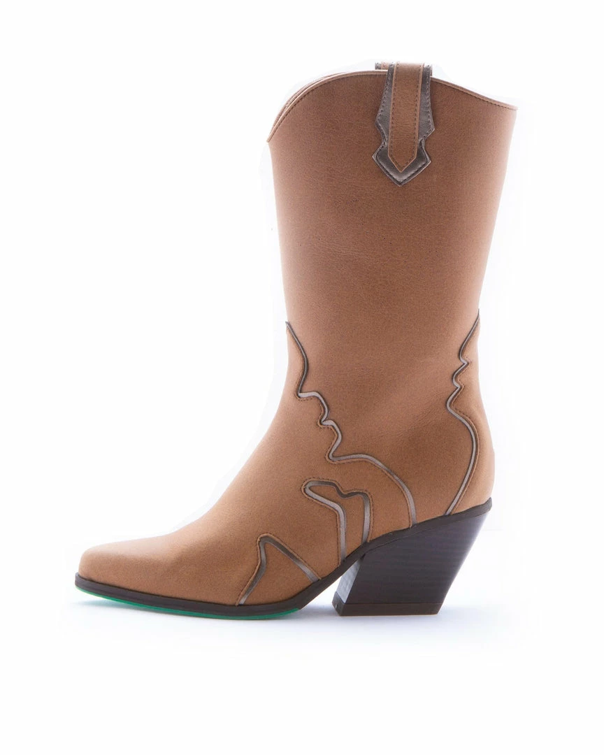 The Laura western high boots are vegan suede and sustainable. They are made from a combination of corn and recycled PET. The insoles are 100% cork. The lining is made of OnSteam®, which is a highly breathable microfibre that absorbs humidity very well and looks and feels like leather. The recycled rubber outsoles printed in their signature green leaves not only provide great grip, but also shows love for nature and sustainability.