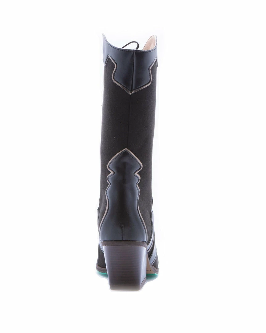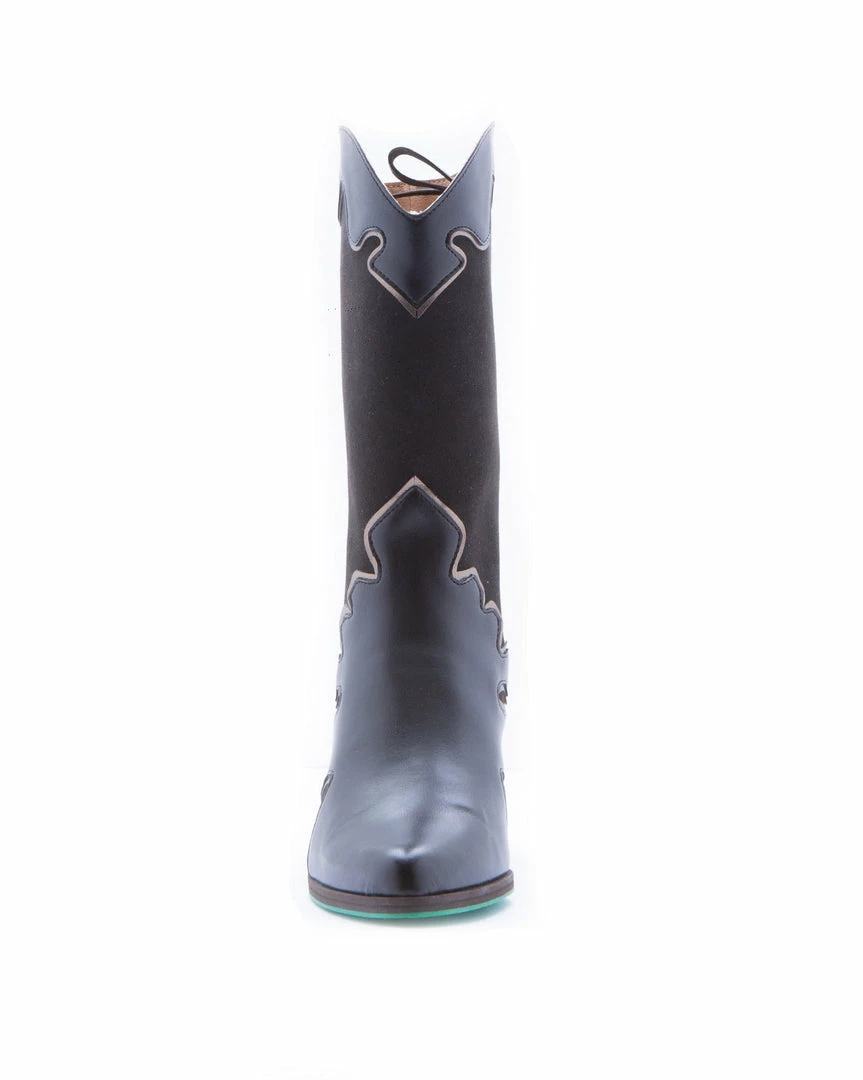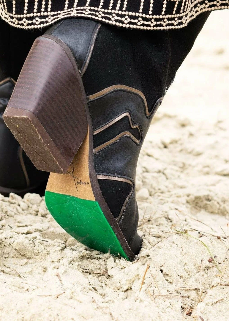 The Sooty high western boots are made of black vegan apple skin leather and vegan suede. The lining is made of OnSteam®, which is a highly breathable microfibre that absorbs humidity very well and looks and feels like leather. The cork insoles make these boots very comfortable and the recycled rubber outsoles printed in their signature green leaves not only provide great grip, but also shows love for nature and sustainability.Â