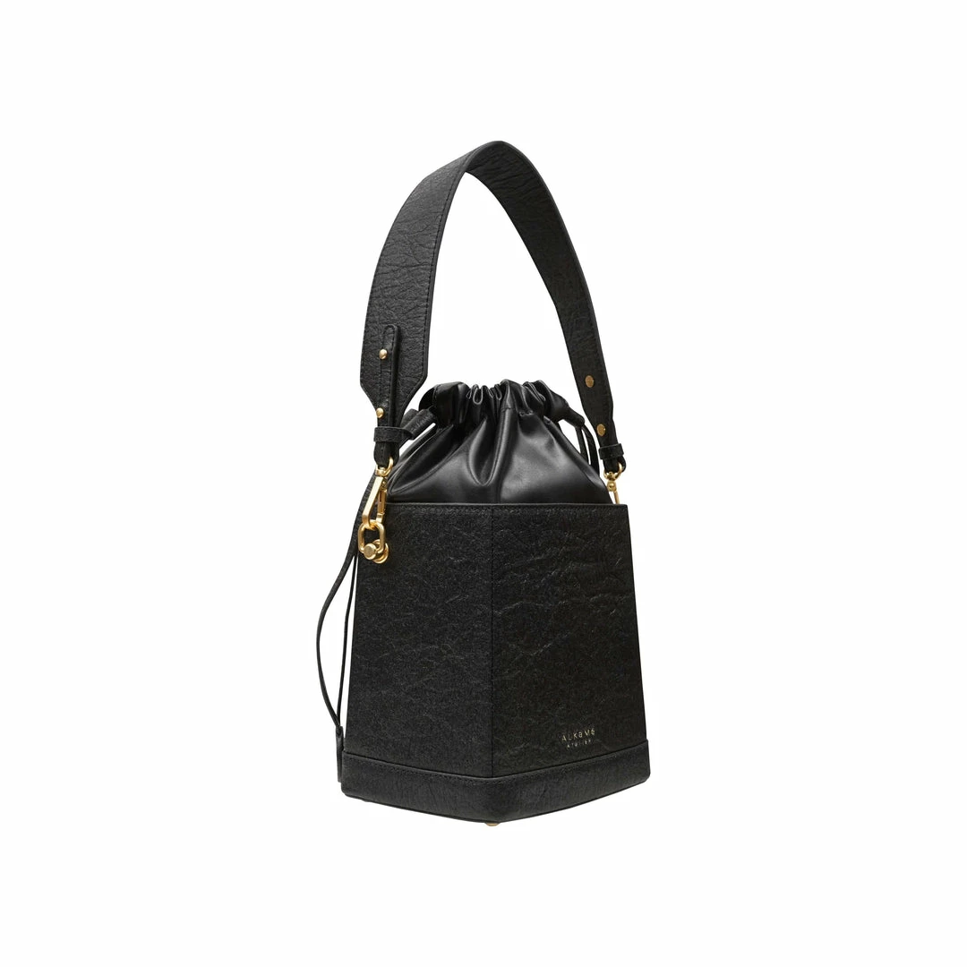 The top drawstring pouch of the bag is made in an innovative Vegan Leather, exclusive to ALKEME ATELIER. The material is lightweight, scratch resistant and high in strength. They produce this card case in a factory that is ISO 9001 certified.