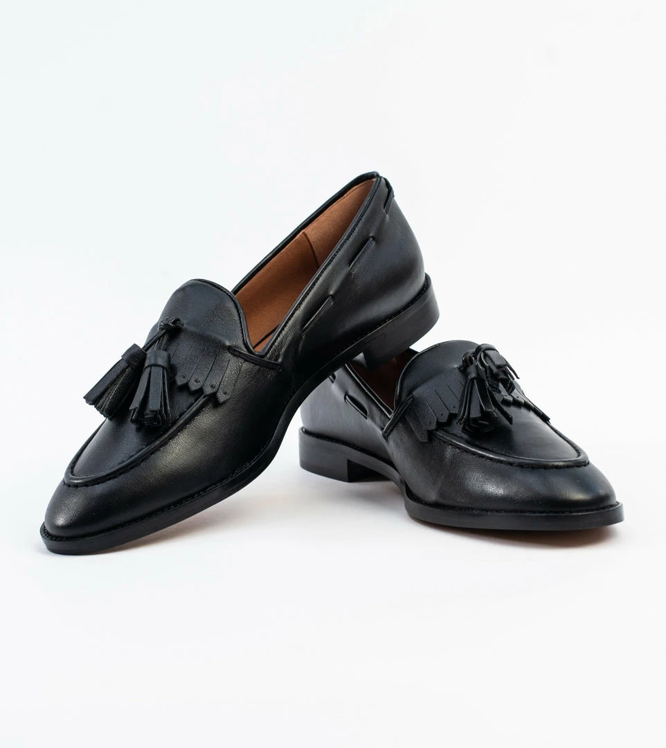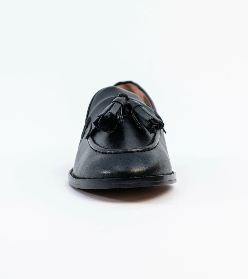 Introducing Alice: a classic tassel loafer. This stylish hand stitched loafer with fringe detail is an essential slip on shoe to suit any wardrobe. The Alice loafer in black vegan leather is ideal for work and weekends alike. Wear with tailored trousers or skinny jeans for a super comfortable, all day wearable shoe.