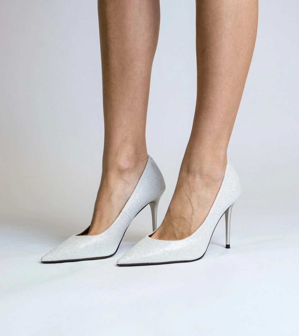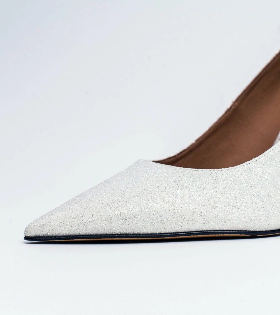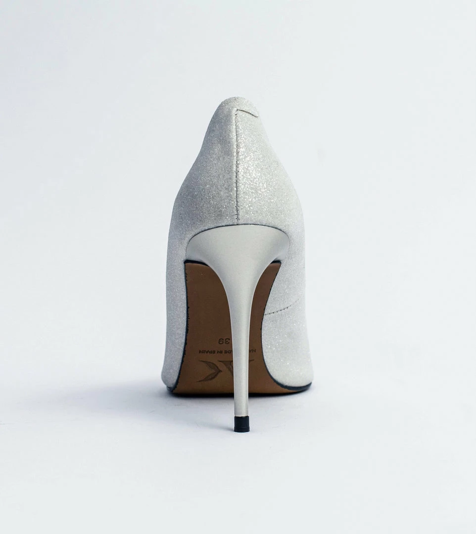 The sparkly Scarlett is a gorgeous party shoe with a slim stiletto 95mm heel and elegant silhouette. Hand stitched in Spain and adorned with glittery vegan leather, this stand out court is sexy and stylish. Perfect for a wedding or any glamorous occasion.