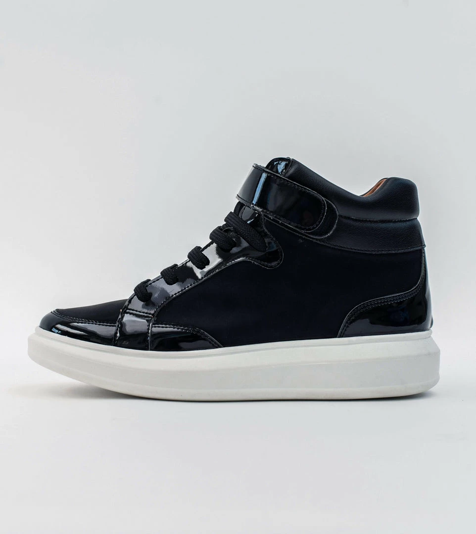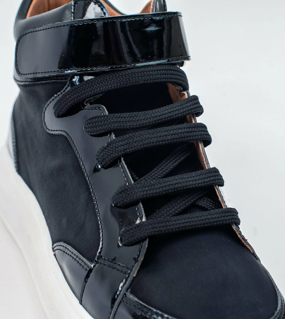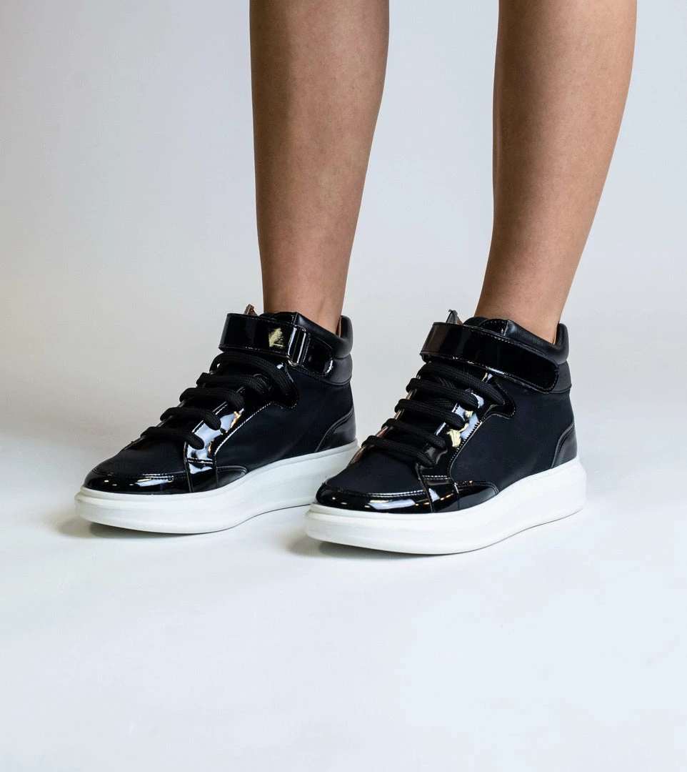 Meet Alicia: the high top black shine trainer. A true statement trainer the Alicia eludes your typical trainer expectation and hits back with glamour, style and distinction. This funky and fun lace up high top is a mix of black vegan leather and patent, and is finished with a thick white sole and velcro buckle.