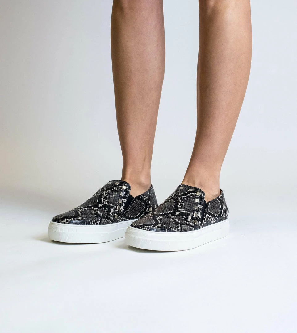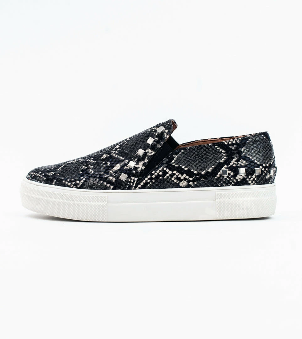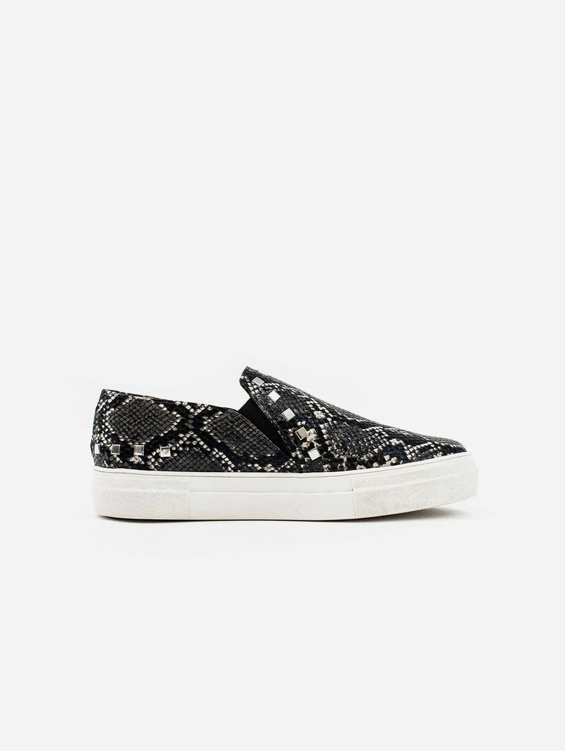 A luxury take on your slip on trainer, the Hayley is a contemporary, easy to wear style. This statement shoe with a chunky white sole adds glamour to your relaxed weekend wardrobe. The black vegan snake skin effect leather is adorned with silver stud details and has elastic inserts to easily slip on.Â