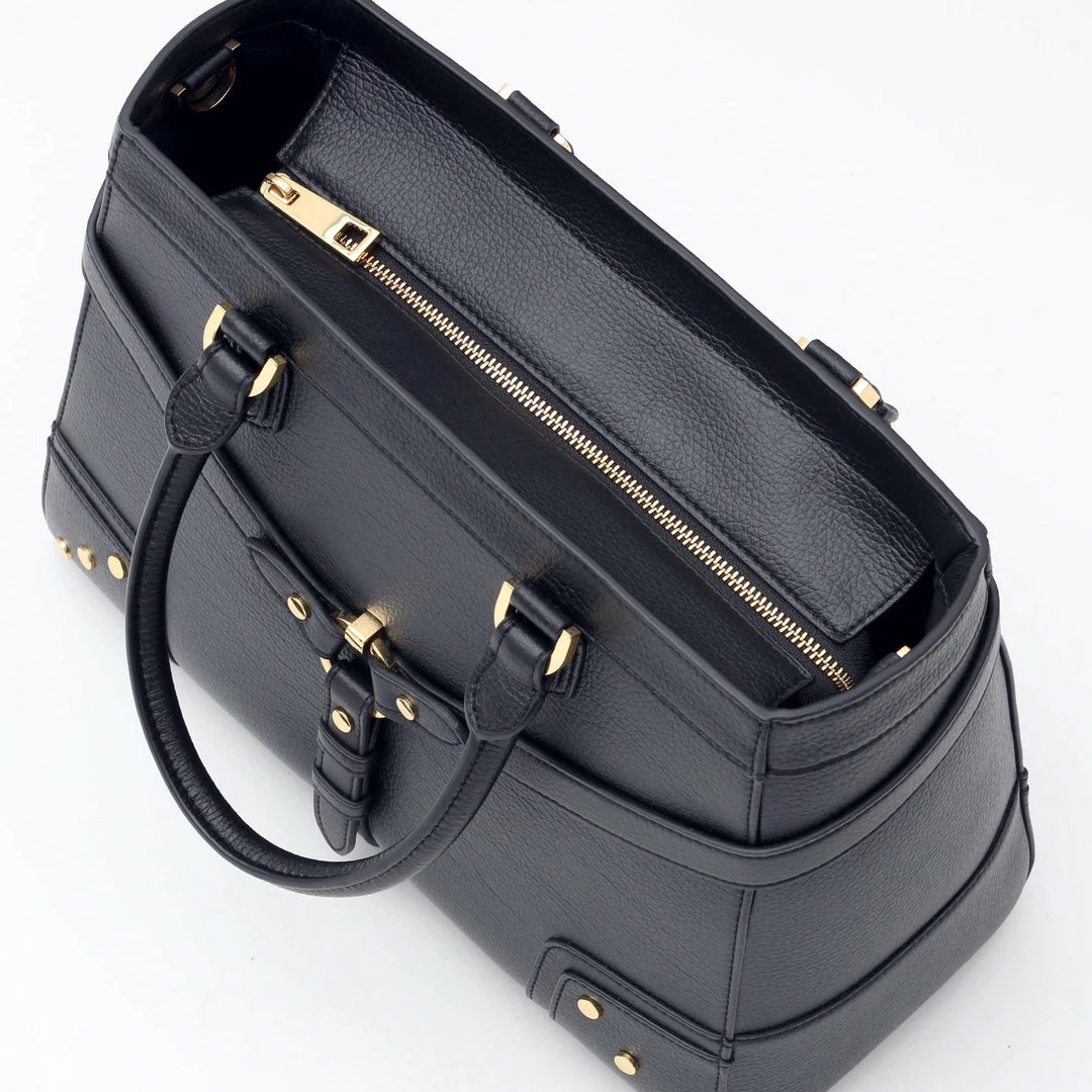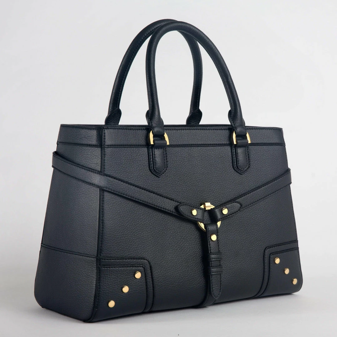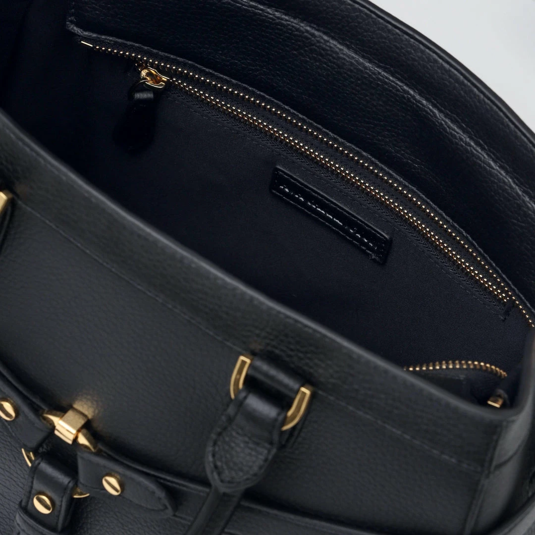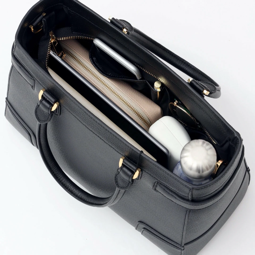 Classic sophistication meets innovation and fashion forward thinking. With attention to detail and a love for quality and ethical fashion, this top-handle bag is crafted by skilled artisans using premium vegan leather, interior lining made from recycled PET bottles and is accented with 24k gold plated hardware. Its remarkable light weight makes it a seamless addition to any occasion, and its bold design makes you stand out wherever you go.