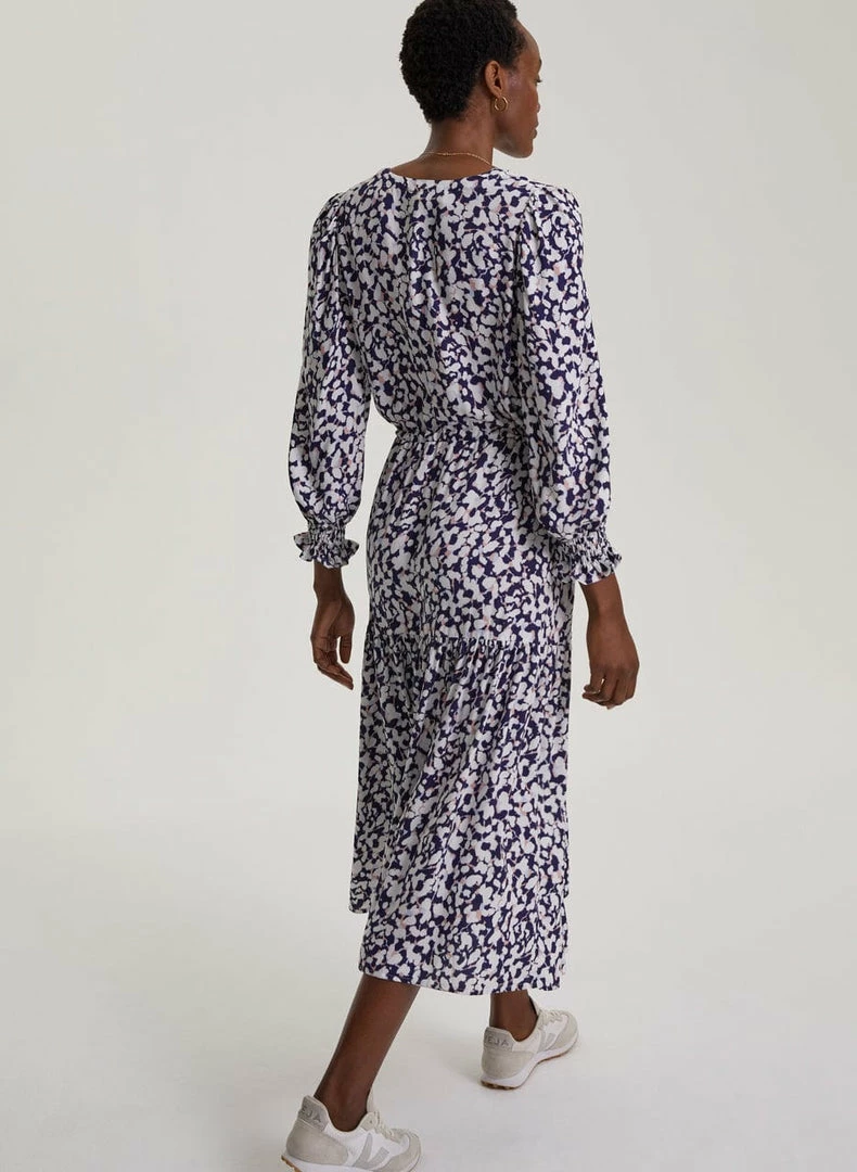 Discover one of Baukjen’s most popular dress shapes in a new abstract leopard print. This is a wonderfully versatile midi which can be styled smartly with heels and a clutch bag, or dressed-down with trainers. It buttons to the waist then cinches around the waist thanks to a drawstring belt. Feminine details such as smocked cuffs and a tiered skirt makes it one of our favourites.