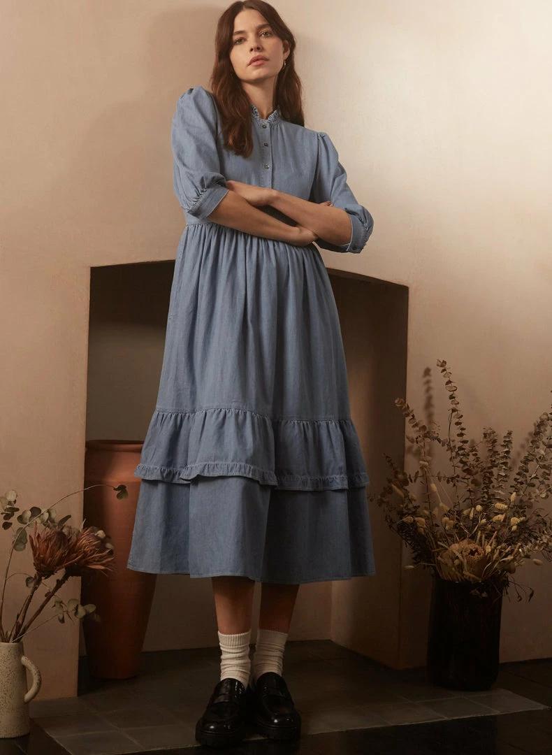 The calf-grazing Alicia dress taps into the prairie trend – a feminine take on dressing that Baukjen love. Made from organic cotton chambray, it looks like denim but is softer (and kinder to the planet). It buttons down to the waist and flares into a generous skirt with a frill-edged tier. It goes with loafers as pictured here, but looks just as cool with chunky ankle boots or sandals when the weather warms up.