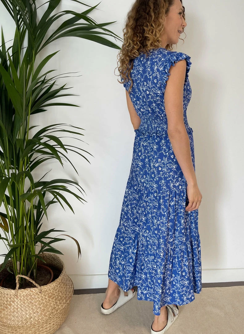 Feminine, flattering, frilly… Beverly is set to be your feelgood summer dress. Crafted from Baukjen’s favourite eco-friendly jersey, a white floral pattern adorns its royal blue base. It comes with smocking around the waist to cinch your silhouette and a ruffle along the shoulders to cover the top of the arms. Just add sandals.