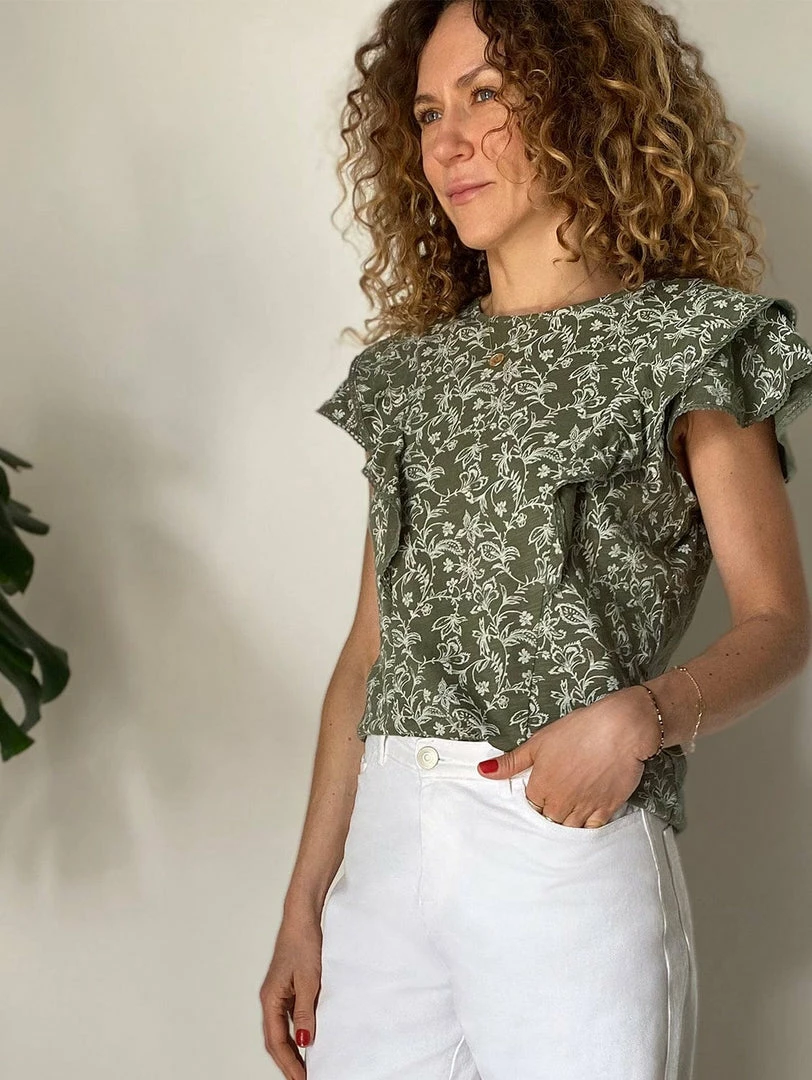 In the same woodland floral print as the flippy Kayla Dress, we love this top’s double-layer frill, which runs diagonally from the shoulders down to the waist. Its organic cotton jersey composition gives it a gorgeous slubby texture, making it the perfect casual partner to jeans and your comfiest shorts.