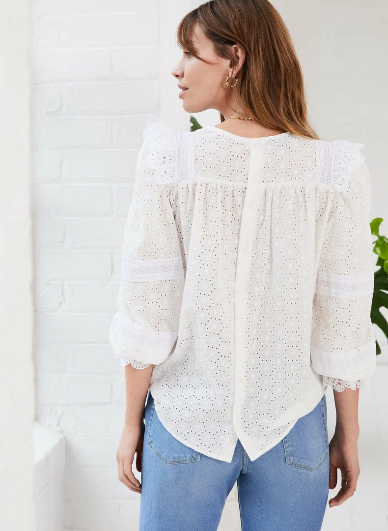 Unapologetically feminine, nothing spells summer like broderie Anglaise. We’re proud that the Daisy is made using surplus fabric – but there’s nothing second-best about it! Look closely and you’ll see lace inserts in the sleeves, scalloped cuffs, and ruffled trims on the shoulders. The perfect top to take your jeans into summer, remember that when this style is gone, it really is gone!