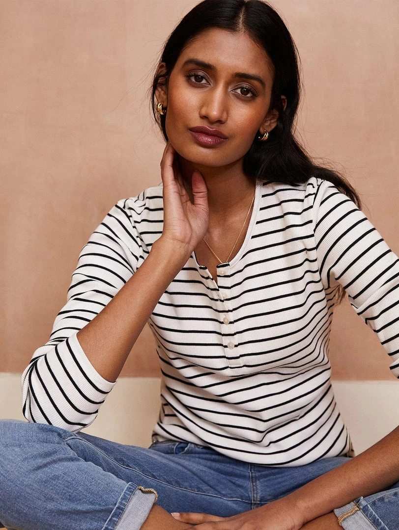 For casual days, your denim will love this new Henley top. Cut for a flattering fit, it’s made from soft organic ribbed cotton and features a simple crew neck with a half-button detail. Available in plain off-white and two striped colourways, there’s a case to welcome all three into your capsule of elevated basics!