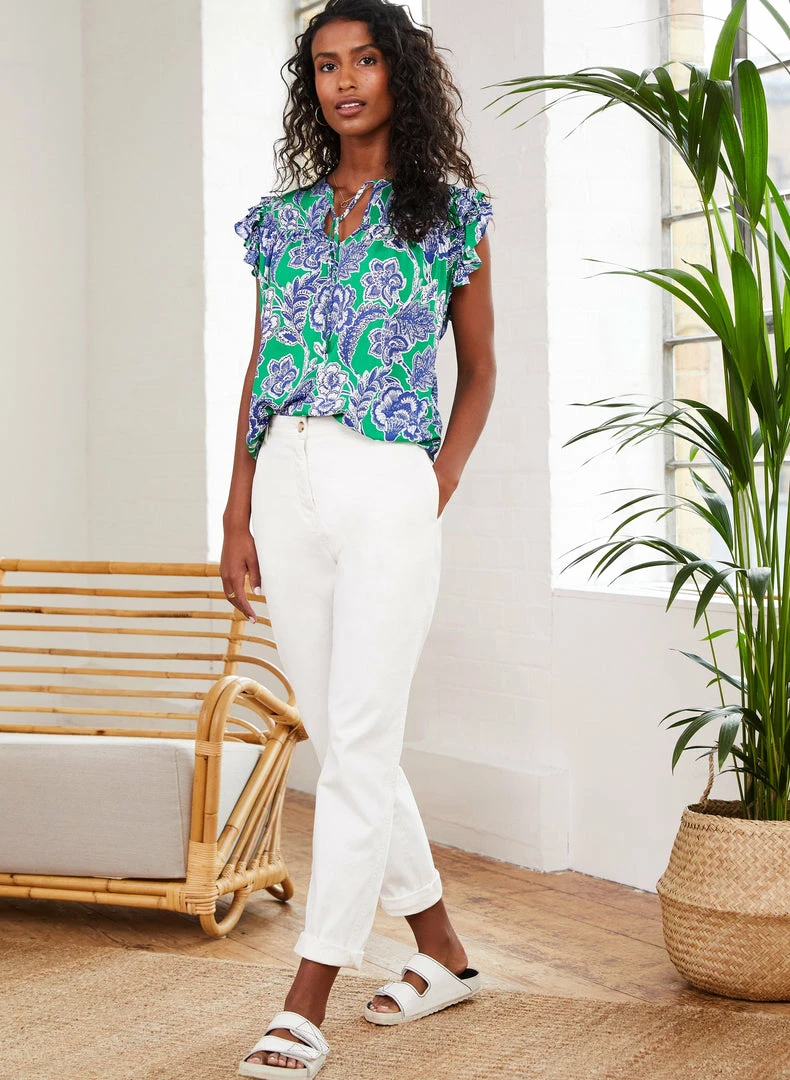 The Everly is all you need to make a stylish statement out of even the simplest jeans or shorts. Its bold pattern will transport your wardrobe to the glamorous Amalfi Coast, whilst its relaxed shape is easy and flattering – note the frills on the shoulders to cover the tops of the arms. Cut from responsibly sourced voile for a relaxed fit, you won’t be stuck on what to wear this summer.