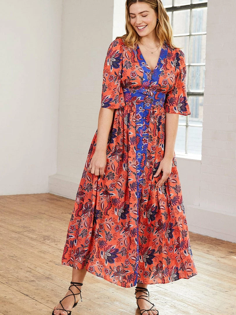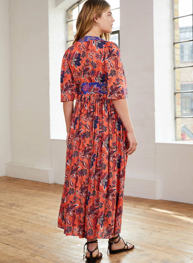 If you’re looking for a dress to take you from the beach to sundowners, the search ends here. So easy and flattering, Leilani is inspired by the glamour and versatility of a wafty kaftan – but with a little more structure. This statement style buttons right the way through, and a curved panel flatters the waist. Made from flowing eco-friendly voile, it features elbow-length sleeves and a contrasting blue trim.