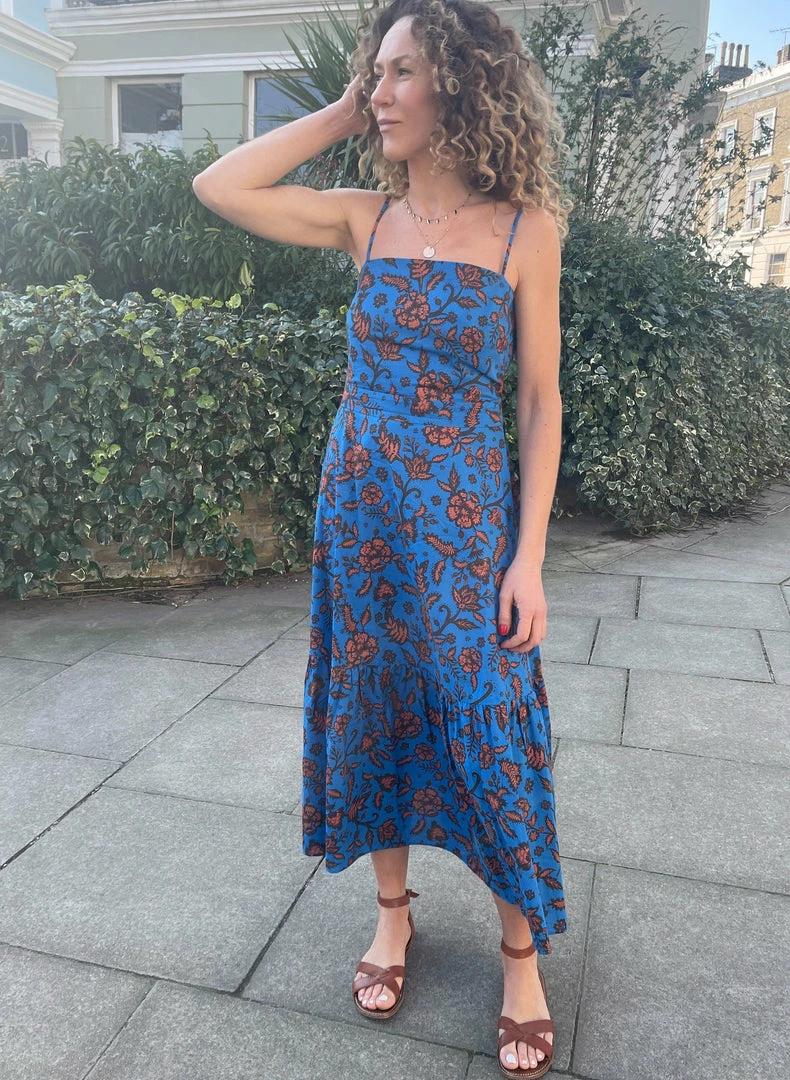 Prepare to turn heads in this dazzling design! Tammy features a chocolate-brown floral print on an azure blue base, inspired by the tiles found on Capri on the Amalfi coast. This statement style is fitted through the body and hips then graduates to a looser skirt with a peplum hem. The straps are elegantly narrow, and the back has a half-moon opening, but Baukjen cut it to just the right proportions so that a strapless bra can be worn. Accessorise with a wide-brimmed hat and a glass of something chilled.