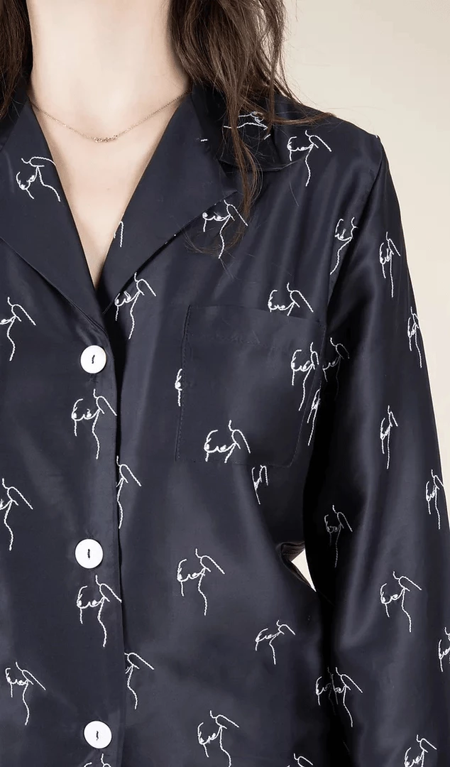 The Character Edition comes embroidered with a flirty and fun pattern. These vegan silk pyjamas will be your favourite home uniform.