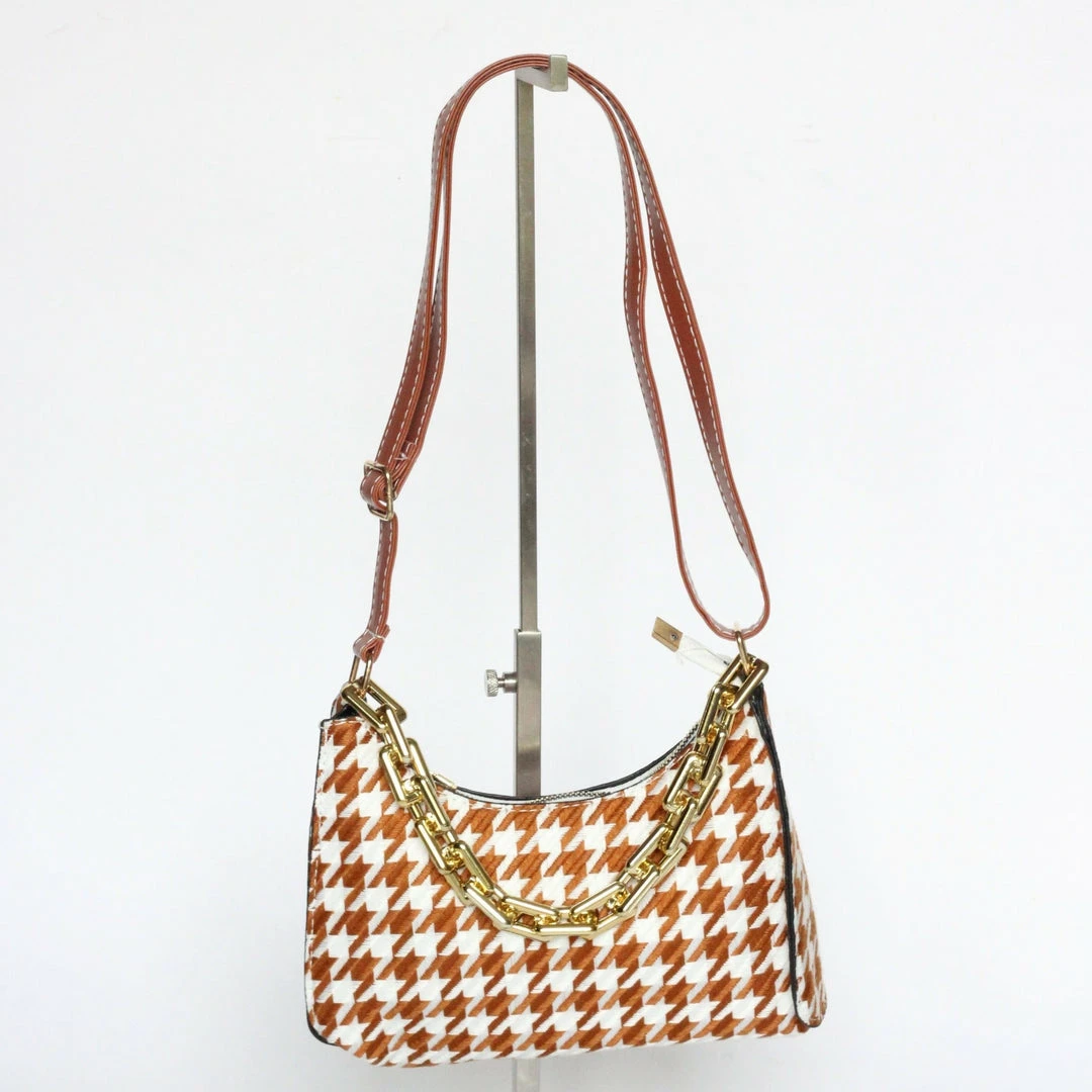 The mini Cassia bag is a crossbody made from houndstooth fabric. It sits perfectly on the shoulder, making it lightweight and easy to carry with the adjustable strap. It is also designed with a gold zipped fastening to keep belongings secure. The gold chain detail handle is lightweight, making it practical and functional.Â