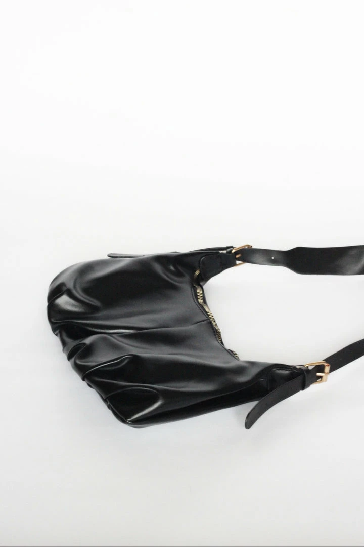 The Ella ruched bag is crafted from the softest faux leather. It sits perfectly on the shoulder, making it lightweight and easy to carry with the adjustable strap. Designed with a gold zipped fastenings and buckle fastenings to keep belongings secure.Â