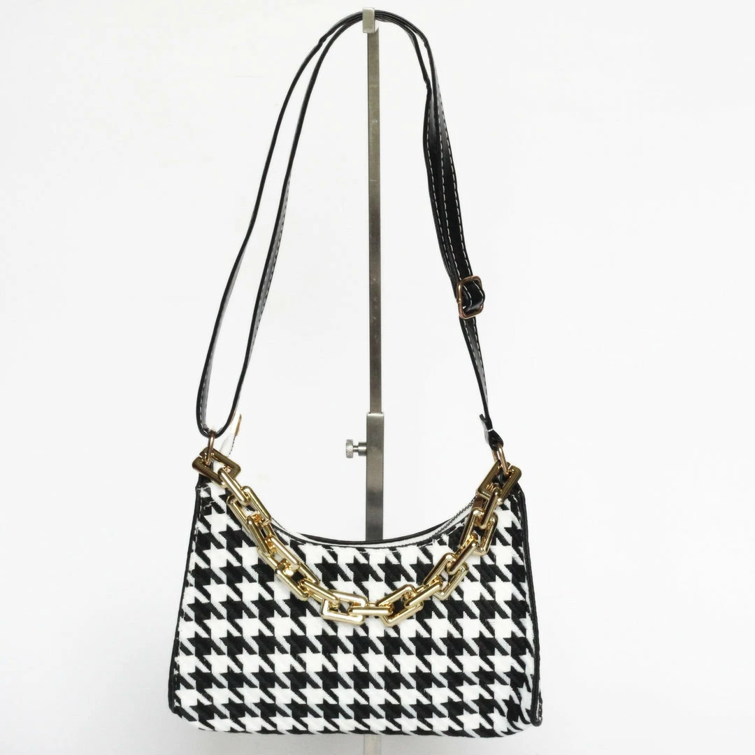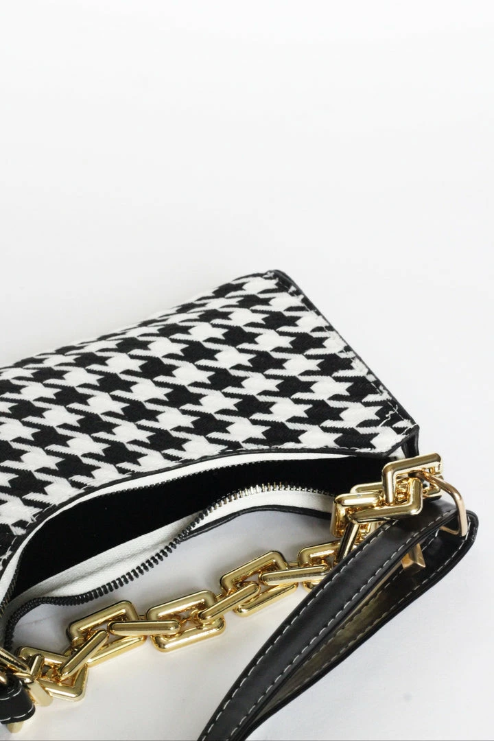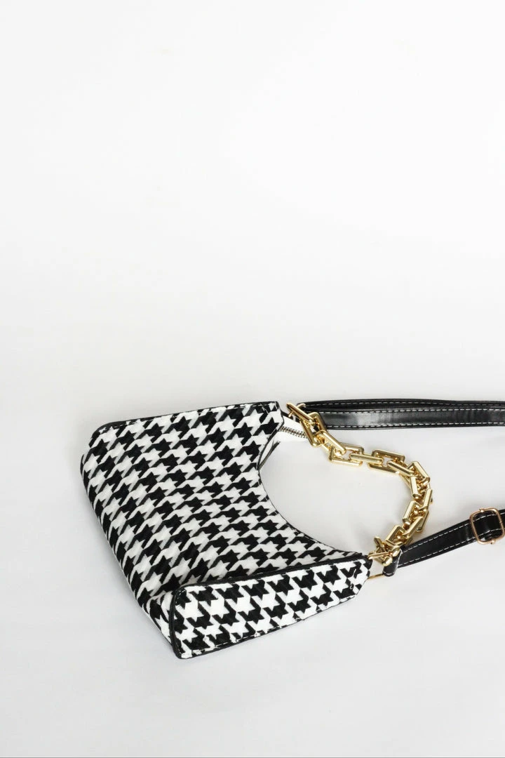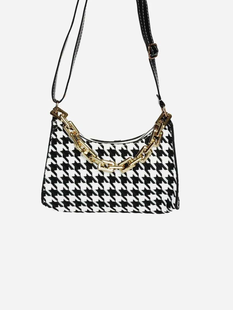 The mini Cassia bag is a crossbody made from houndstooth fabric. It sits perfectly on the shoulder, making it lightweight and easy to carry with the adjustable strap. It is also designed with a gold zipped fastening to keep belongings secure. The gold chain detail handle is lightweight, making it practical and functional.Â