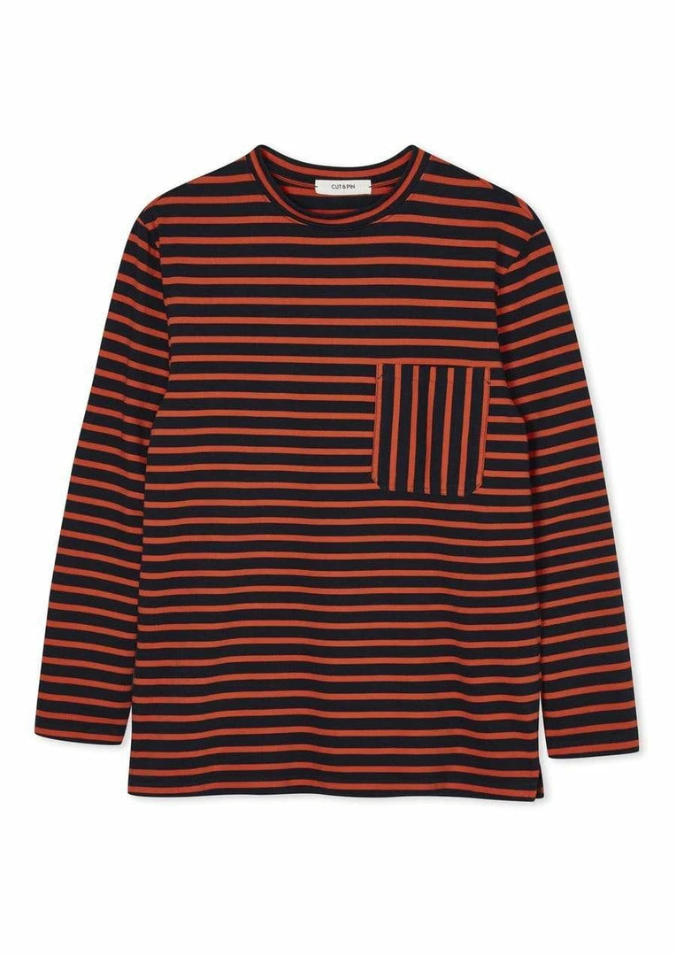 A twist on the classic Breton stripe, this navy and red stripe long sleeve tee will see you through the season and beyond. It has an oversized feature chest pocket and is made in 100% cotton deadstock jersey fabric, this is a Cut & Pin wardrobe essential.