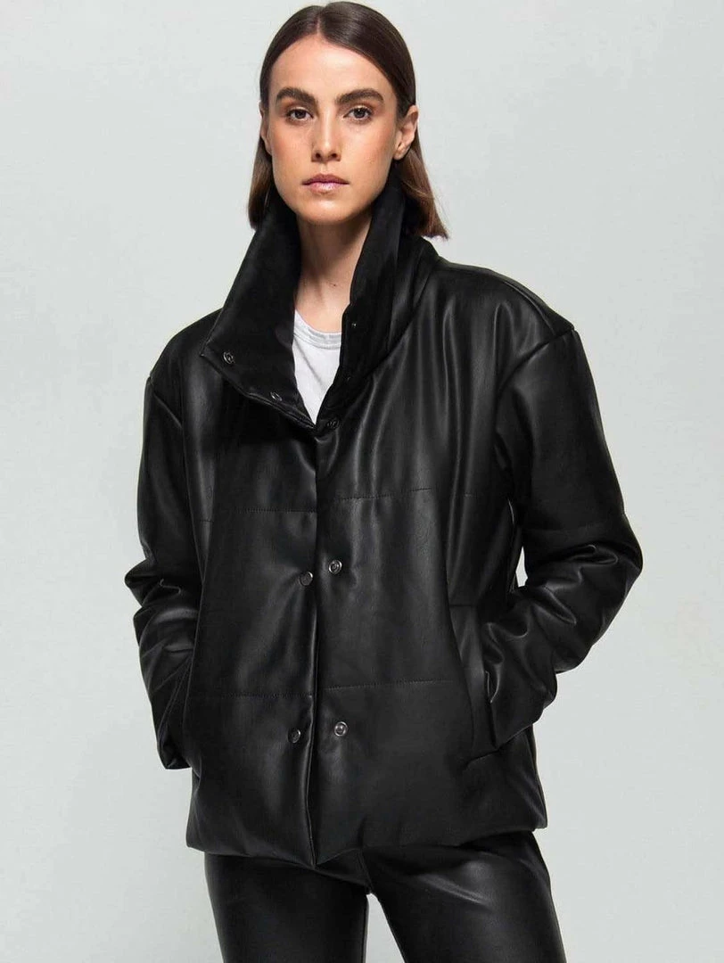 Long sleeve quilted puffer crafted from soft vegan leather. Features a stand collar, matte black press-stud front closure and fully lined with cotton and polyester for comfort.