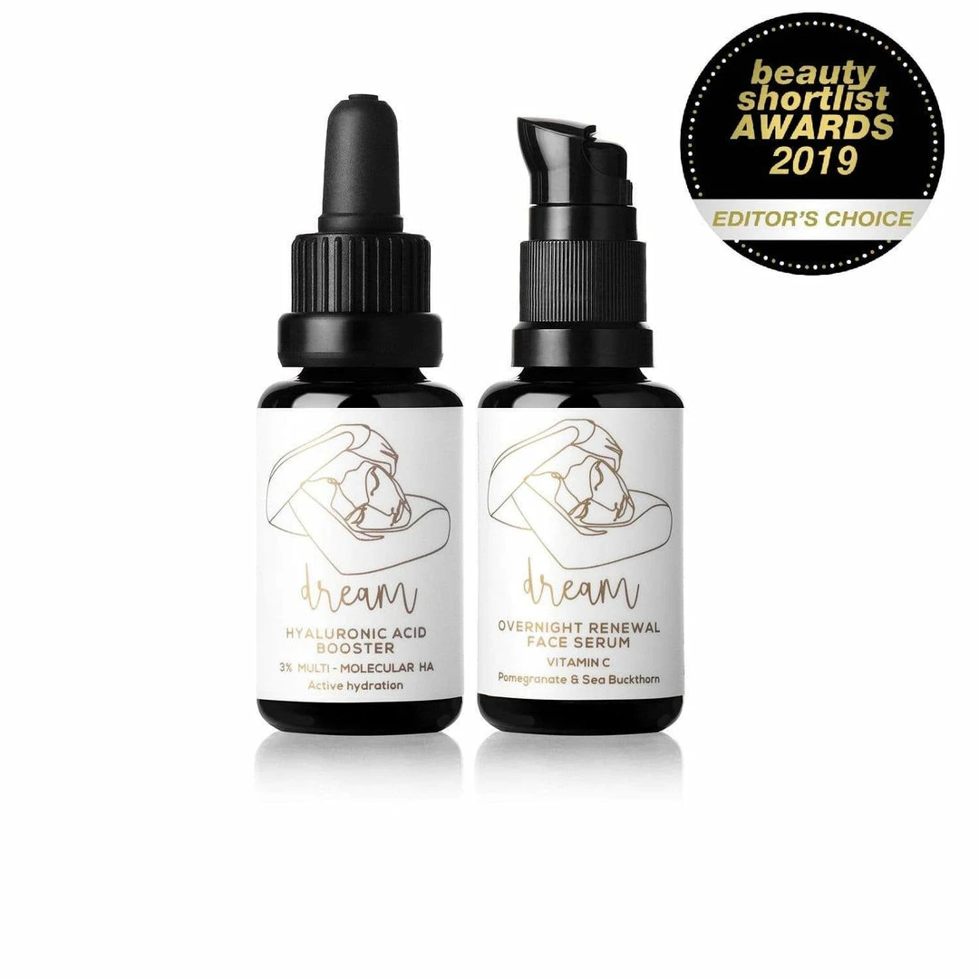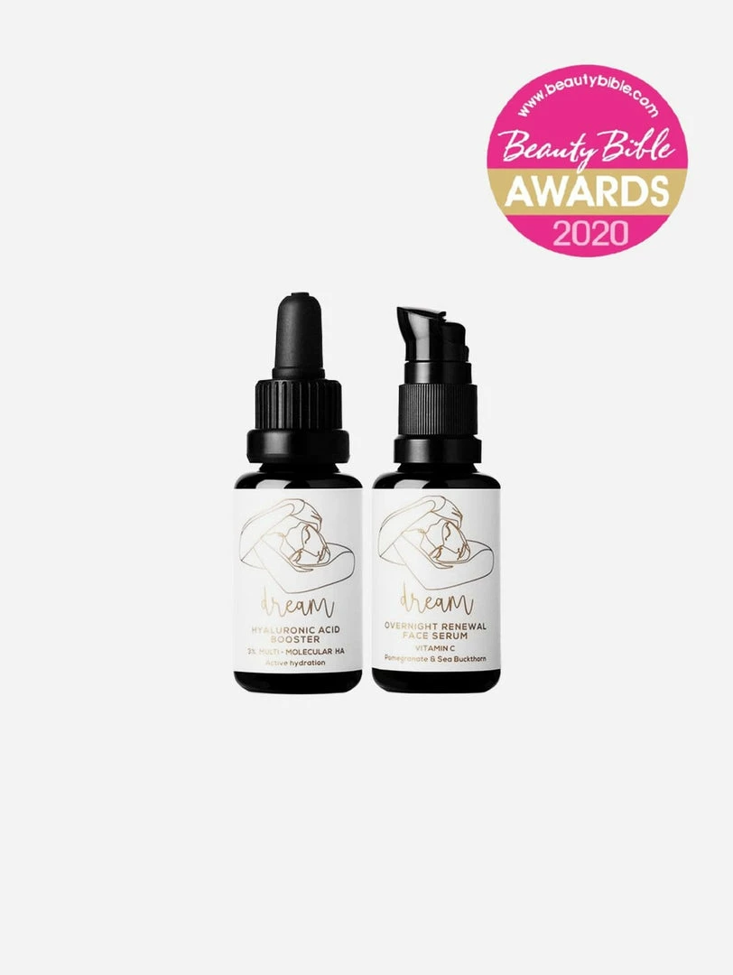 The Dream Hyaluronic Acid Booster Serum provides active hydration, which supports skin’s vitality and renewal at the cellular level, while the Dream Overnight Face Renewal Serum, rich in luxurious plant oils, potent botanical actives, vitamins C and E, nourishes, and conditions your skin. Together they target uneven looking, tired or mature skin, delivering radiance-boosting activities to the skin cells.