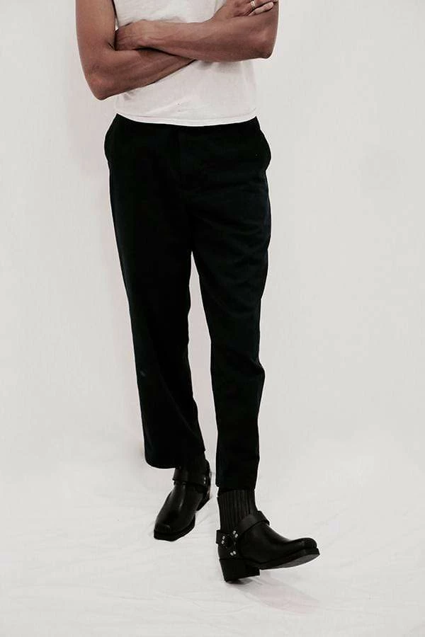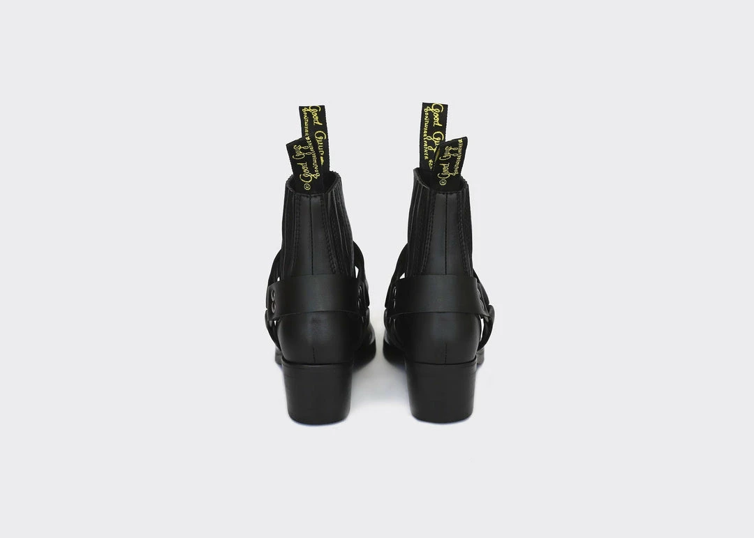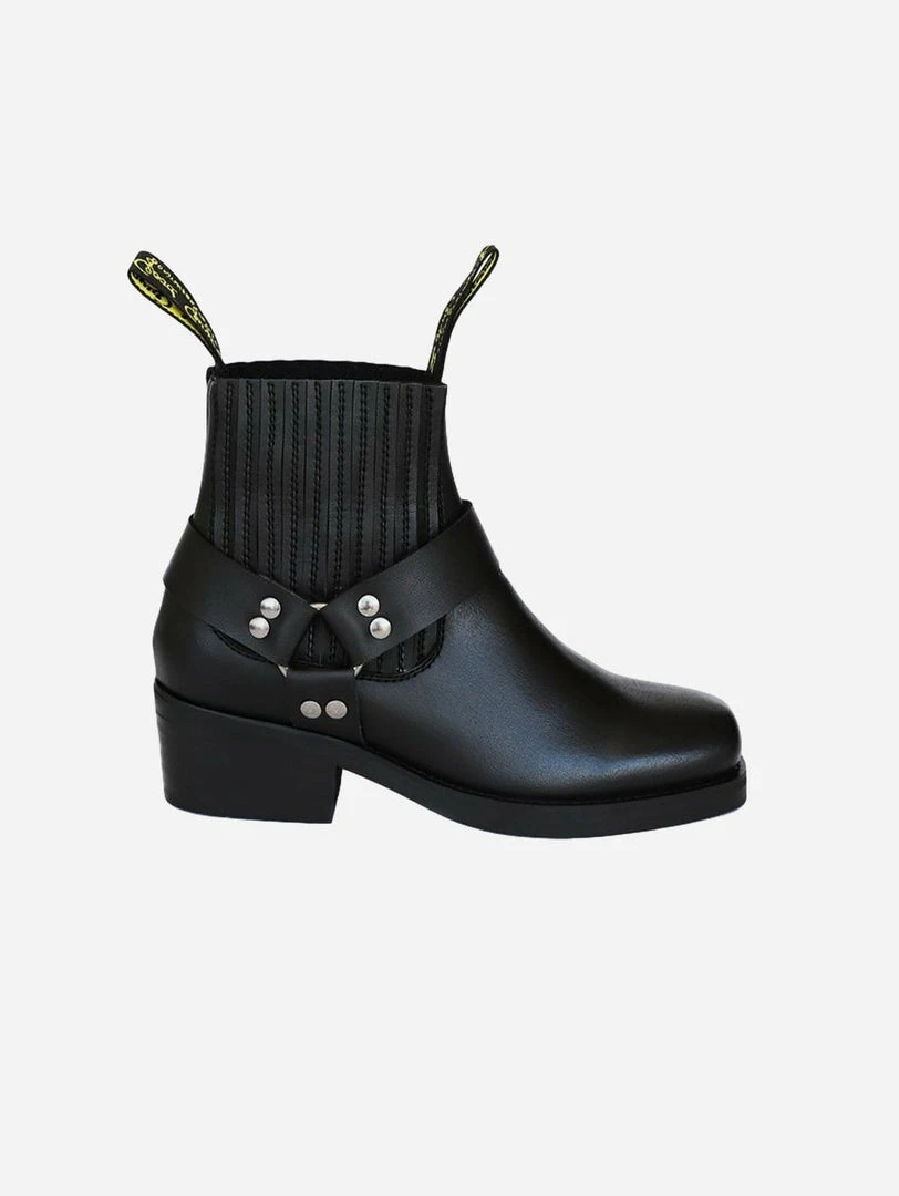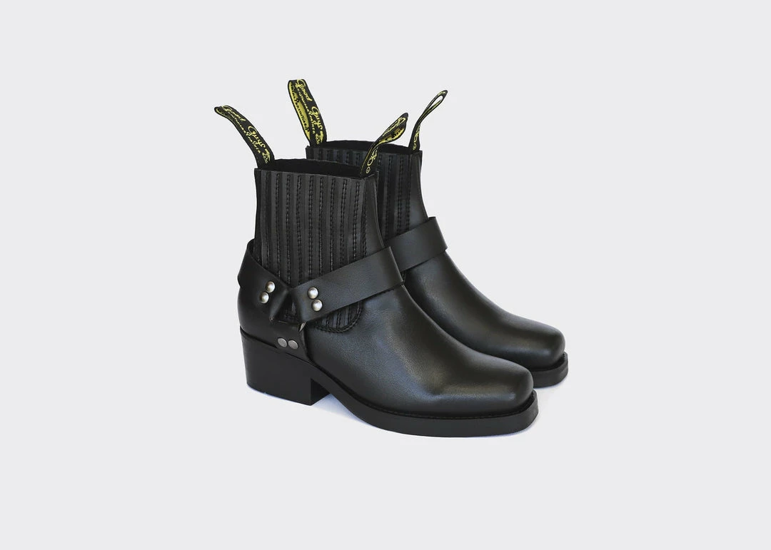 EDDIE is a black vegan harness motorcycle ankle boot with a square toe-shape that are made to give you the 90’s look you might be craving. These boots are a classic rock n’ roller look that you can wear with various different outfits like a skirt or a pair of jeans. They are made of a smooth and resistant upper microfiber, with an elastomer sole and wooden heels.Â