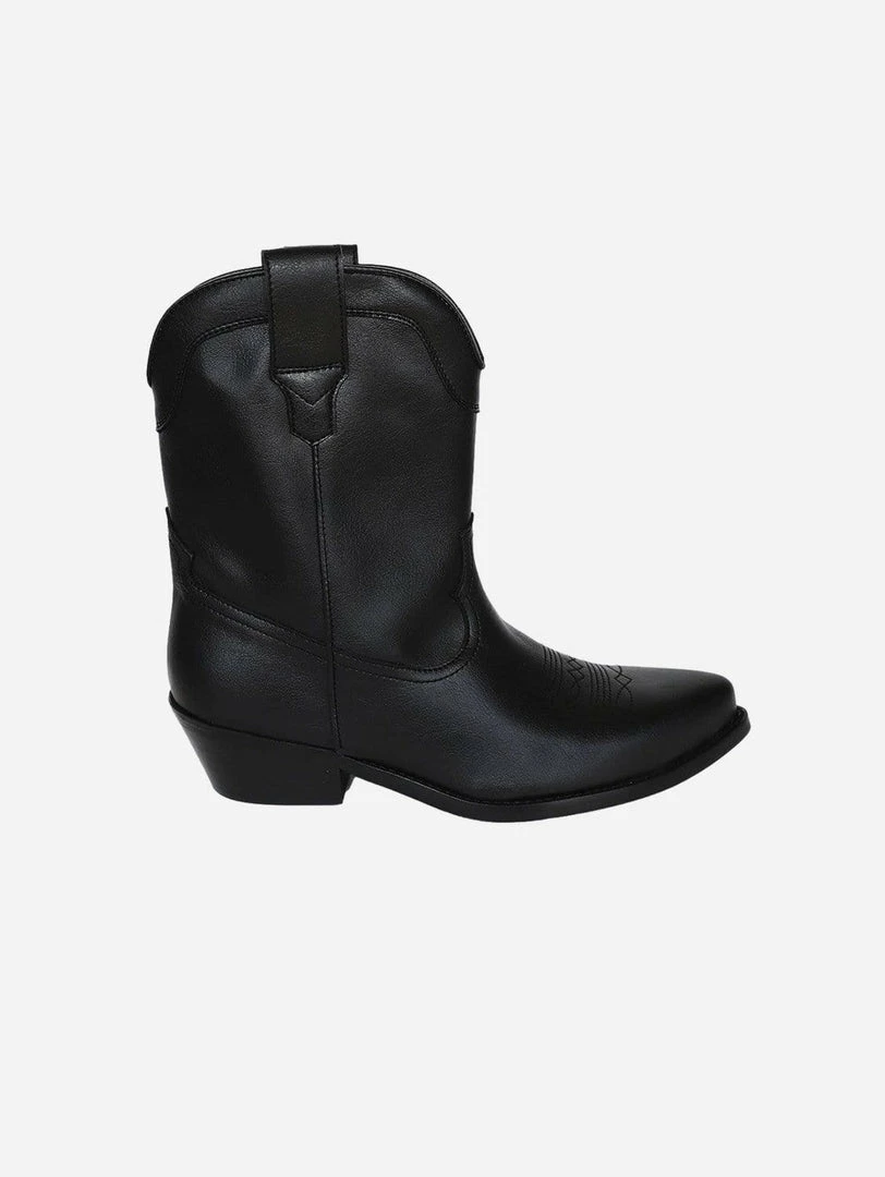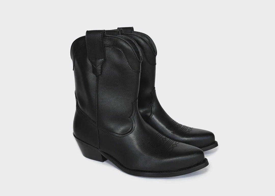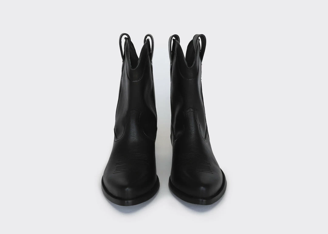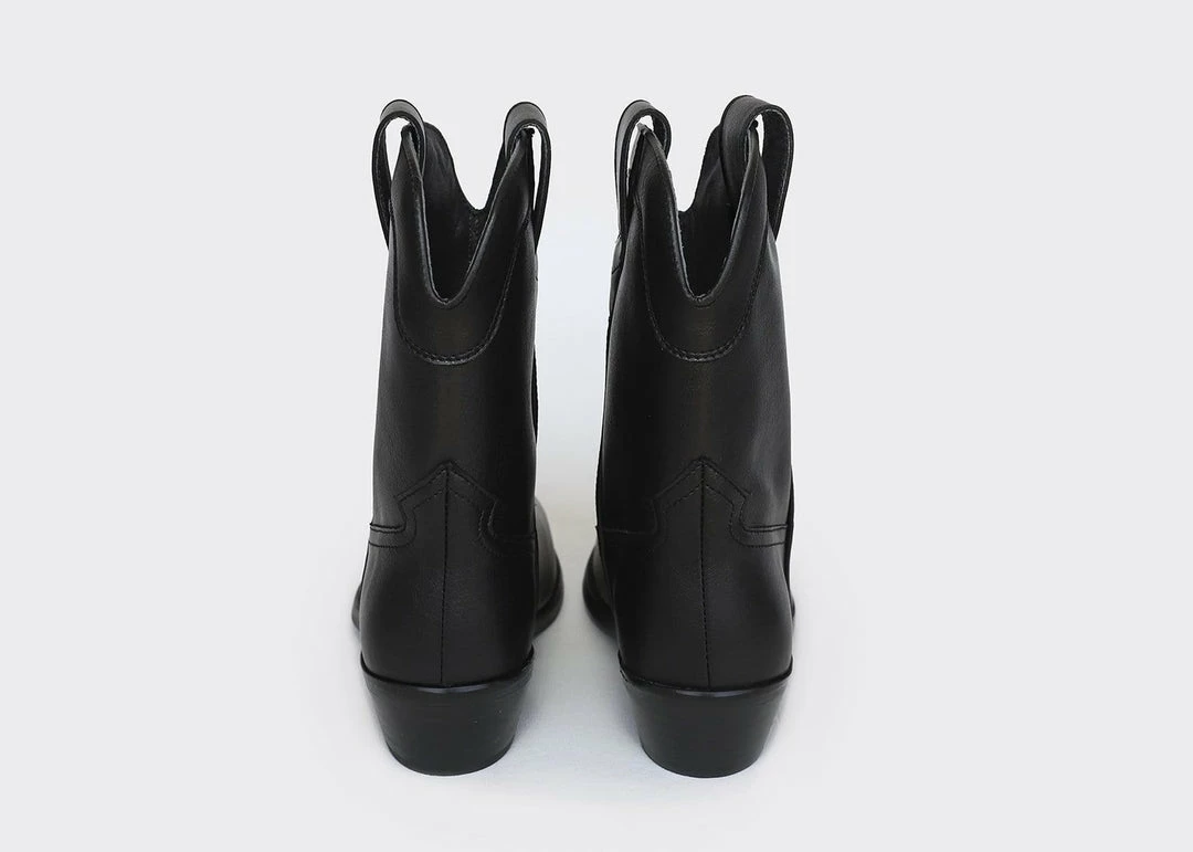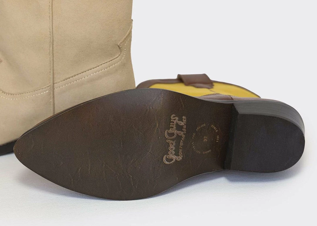 Gabe is a mid-calf western boot with small heels, smooth vegan leather upper, and plant-based lining. The Gabe is the lower version of Good Guys Lucky high-top western boots.