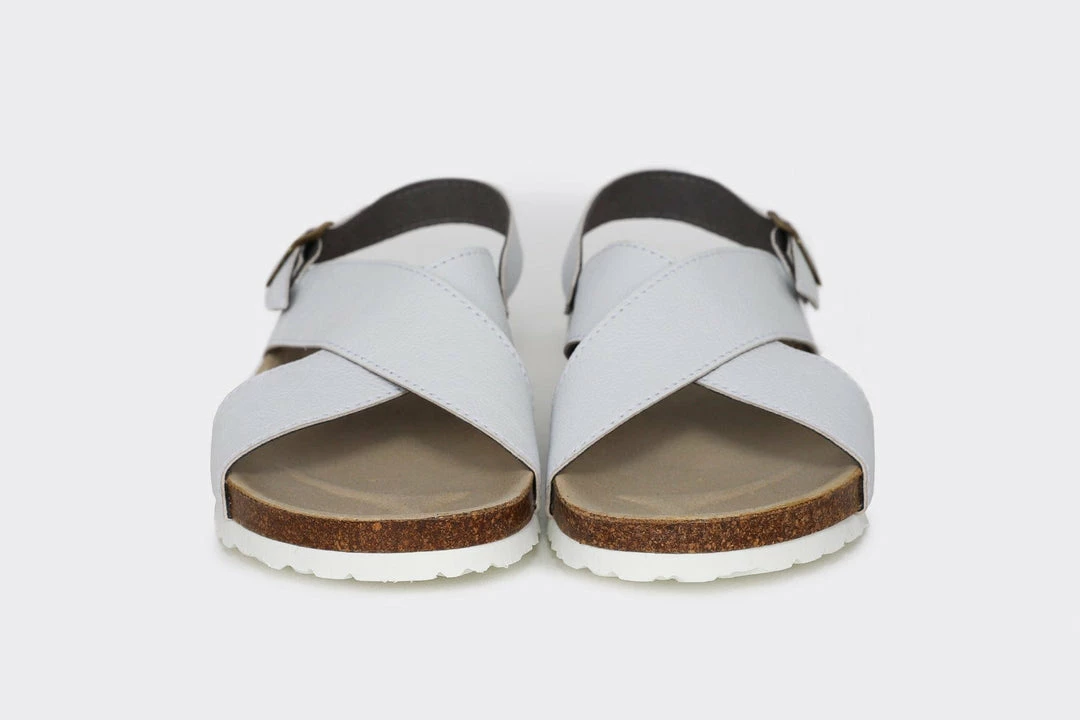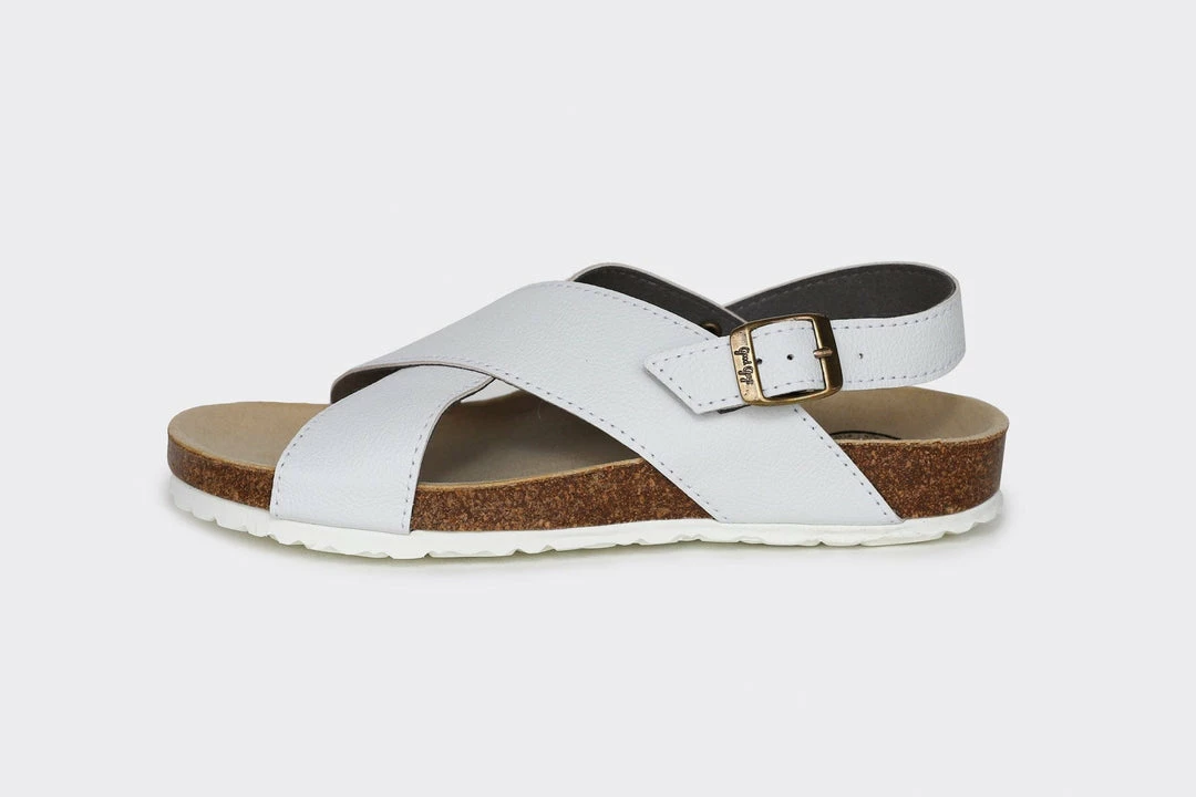The ’90s are back! Mimi in White Appleskinâ„¢ is the perfect classic pair of eco-friendly vegan slide-on sandals for this summer. These sandals are very comfortable and feature a cross strap with a buckled back strap and an anatomically contoured footbed. Mimi has a wide fit and plant-based microfibre lining, perfect for the summer barefoot or to wear mid-season with an additional pair of cute socks.