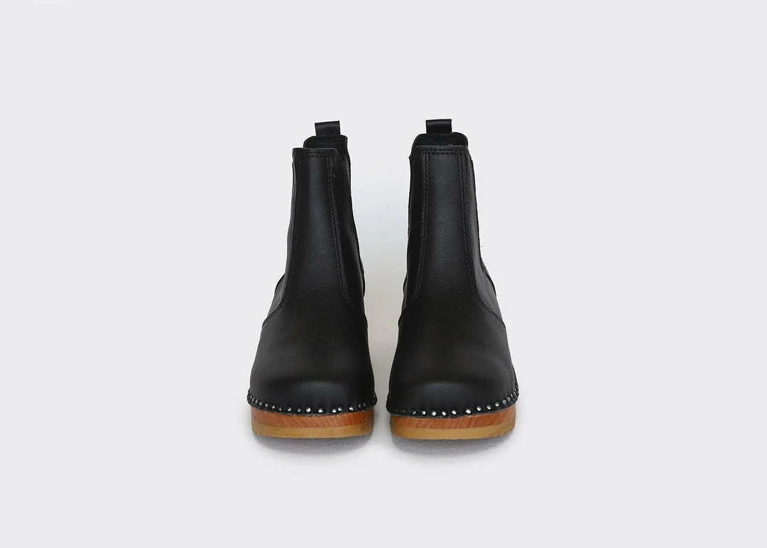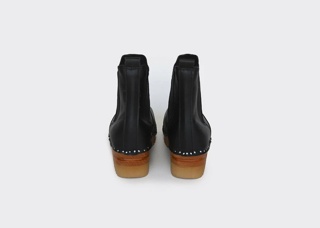 ROCKWELL black vegan leather Chelsea Clog boots are a variation on the traditional Swedish clogs. They are the latest addition to the ongoing collaboration with Swedish friends at Troentorp. They will be perfect with a pair of knee-high socks to keep you cozy and warm this winter. Very comfortable, the non-slippery sole is ideal for rainy weather. The upper is also waterproof and easy to clean.