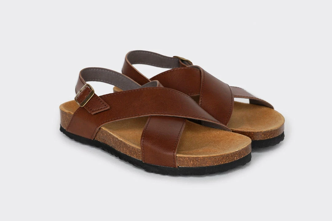 The ’90s are back! Mimi in Brown vegan leather is the perfect classic pair of slide-on sandals for this summer. These sandals are very comfortable and feature a cross strap with a buckled back strap and an anatomically contoured footbed. Mimi has has a wide fit and plant-based microfibre lining, perfect for the summer barefoot or to wear mid-season with an additional pair of cute socks.