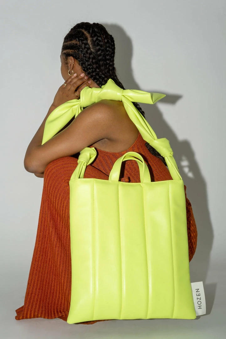 Big business. HOZEN’s quilted vegan leather Market Tote, so fluffy it can double as a pillow, with top handles and a knotted scarf-style shoulder strap does both work and play.