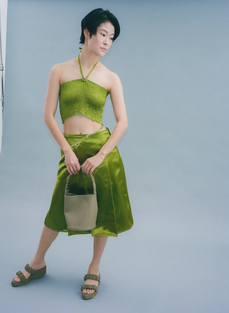 The Phorna scrunchie flatform has a structural modern shape, with scrunch-inspired straps that hold the foot on a memory foam padded sole. Pair it with the accompanying Scrunchie Bucket Bag, which shares the scrunchie-style handle.