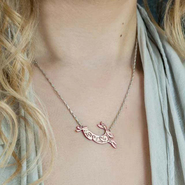 Adapted from a favourite children’s book, this playful folkloric Small Fairtrade Rose Gold Hare Necklace depicts a gracefully leaping hare with beautiful hand pierced detail.
