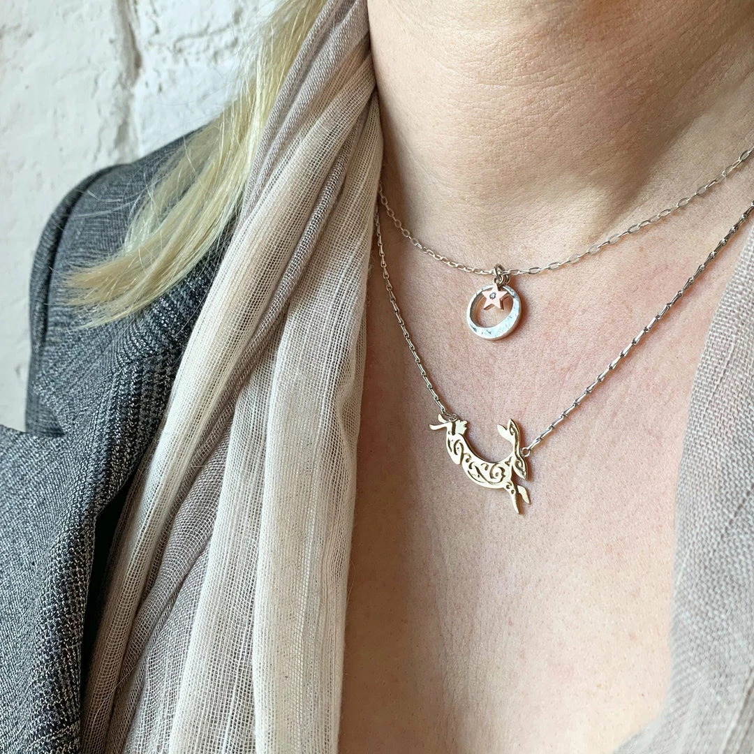 With a vibrant satin sheen, the star charm made from Fairtrade 9ct yellow gold catches the eye with its centre sparkle, a flush-set round 2mm fairly sourced, Sri Lankan White Sapphire solitaire. Set against a gleaming silver moon hand cut from recycled silver, these trinket pendants are suspended together on a fine twinkling 16″ or 18″ silver chain complete with a secure bolt ring clasp.