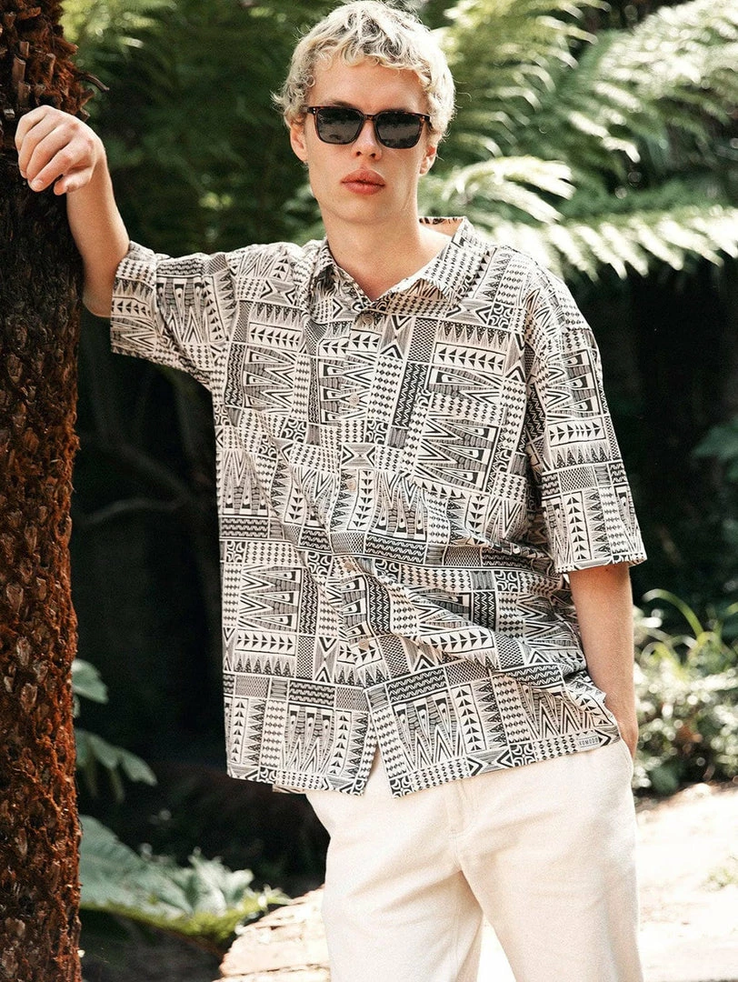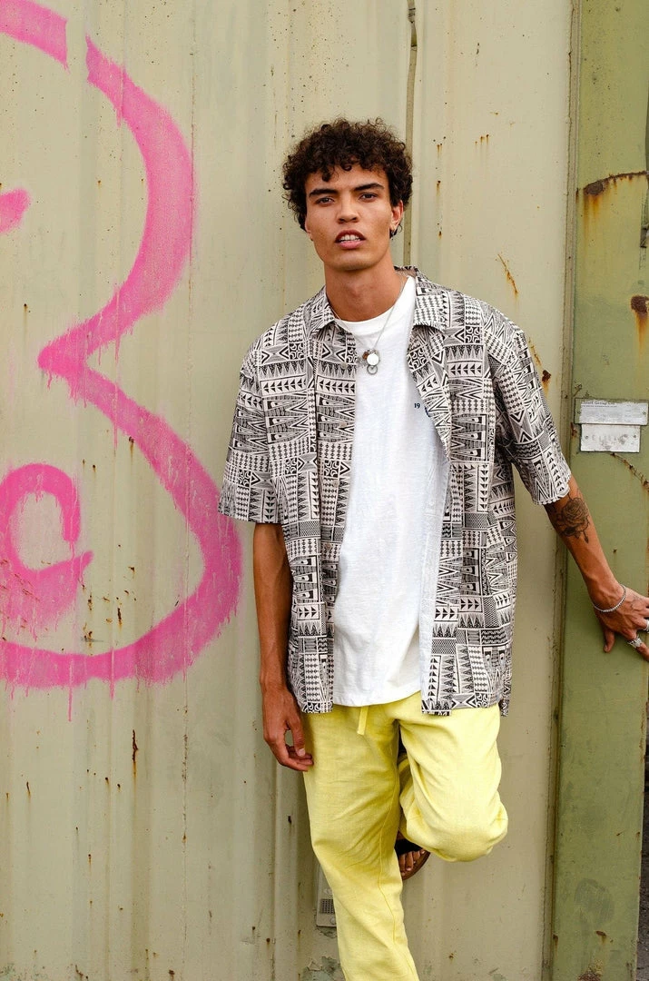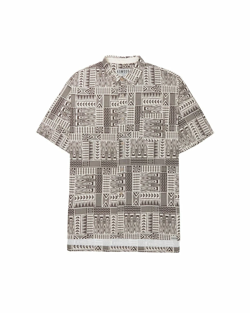 Make a statement this summer with the Dingwalls Shirt in the stylish Tapa Print in Black. The boxy and oversized fit makes this shirt perfect for layering on top of one of Komodo’s graphic tees. Take this shirt from day to night and wear as a button up for those evening occasions!