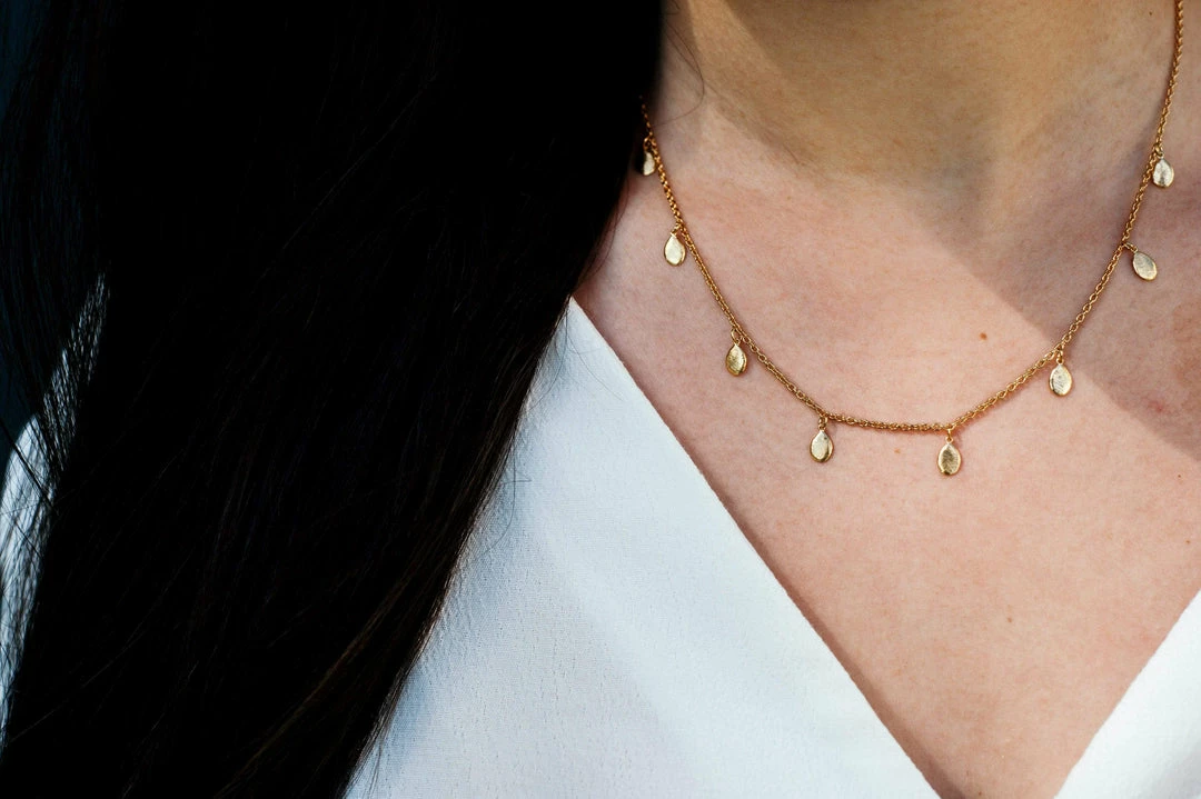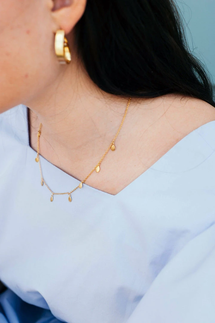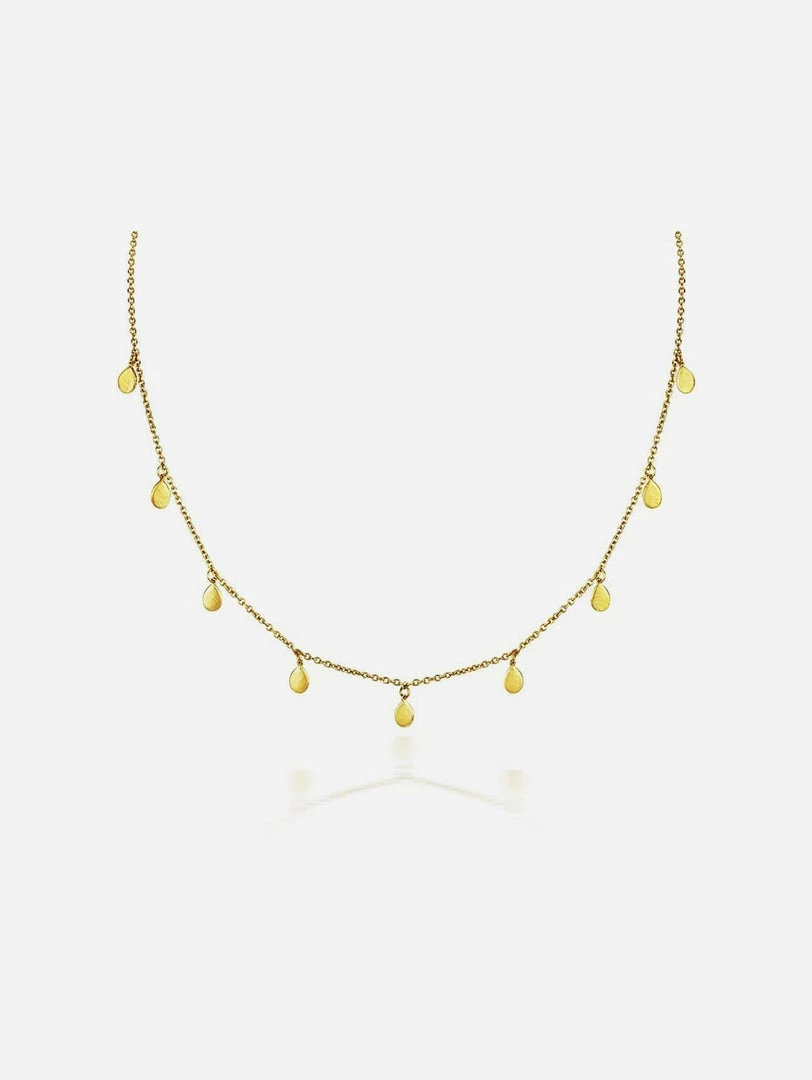 This is the signature piece from the Pip Collection featuring a stunning necklace with nine evenly spaced delicate gold pips hanging around the chain. Designed in collaboration with Indi-Anna Smith. It can be worn at two lengths, one just above the collar bone and one just below.