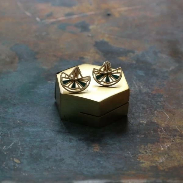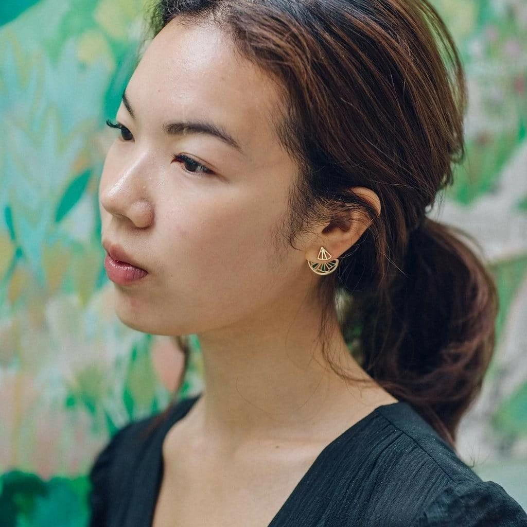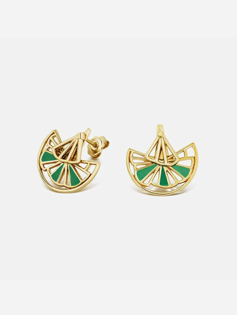A clever and sophisticated earring that doubles up as two pairs. Contemporary and glamorous, you can wear the simple fan centres or as an ear jacket with emerald green wedges.Â