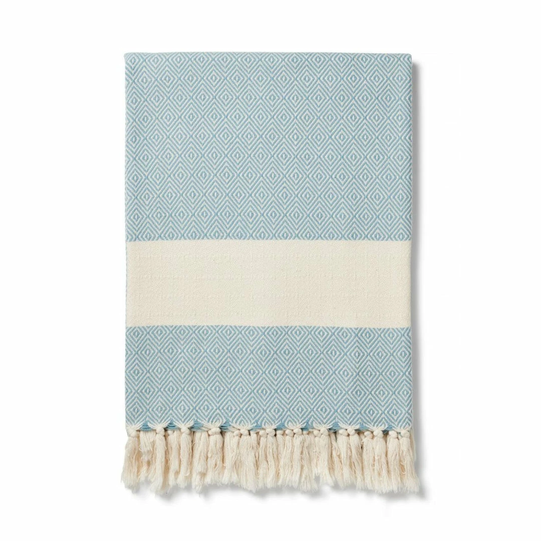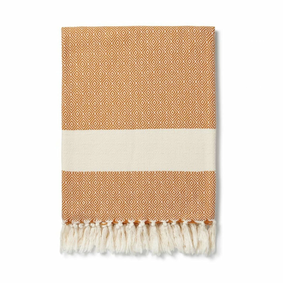 The Damla cotton blanket is big on design and size. In classic geometric weave with block ecru panelling, it’s hand finished with a knotted fringe that adds pattern and texture to your home.
