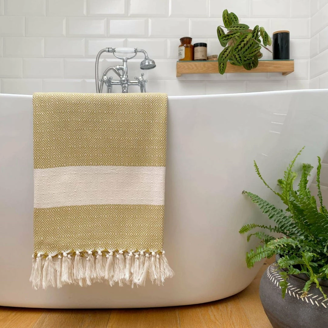 The Damla is a soft, organic cotton peshtemal, with a subtle diamond-weave that’s synonymous with Turkish textile design. Hand-finished with knotted fringing, it’s available in a range of bright and muted tones. This hammam towel will complement your bathroom or your living space, where it can also be used as a throw or baby blanket.