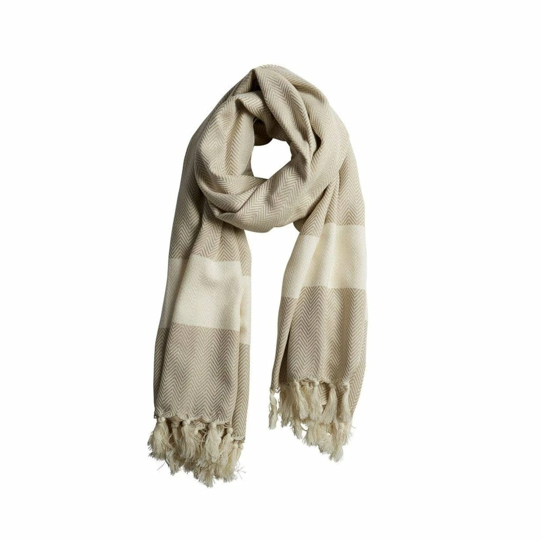 This elegant, herringbone woven scarf (complete with hand knotted fringing), In subtle tones of oyster, ink or moss looks great casually draped over the shoulder, or tied in a simple overhand knot.