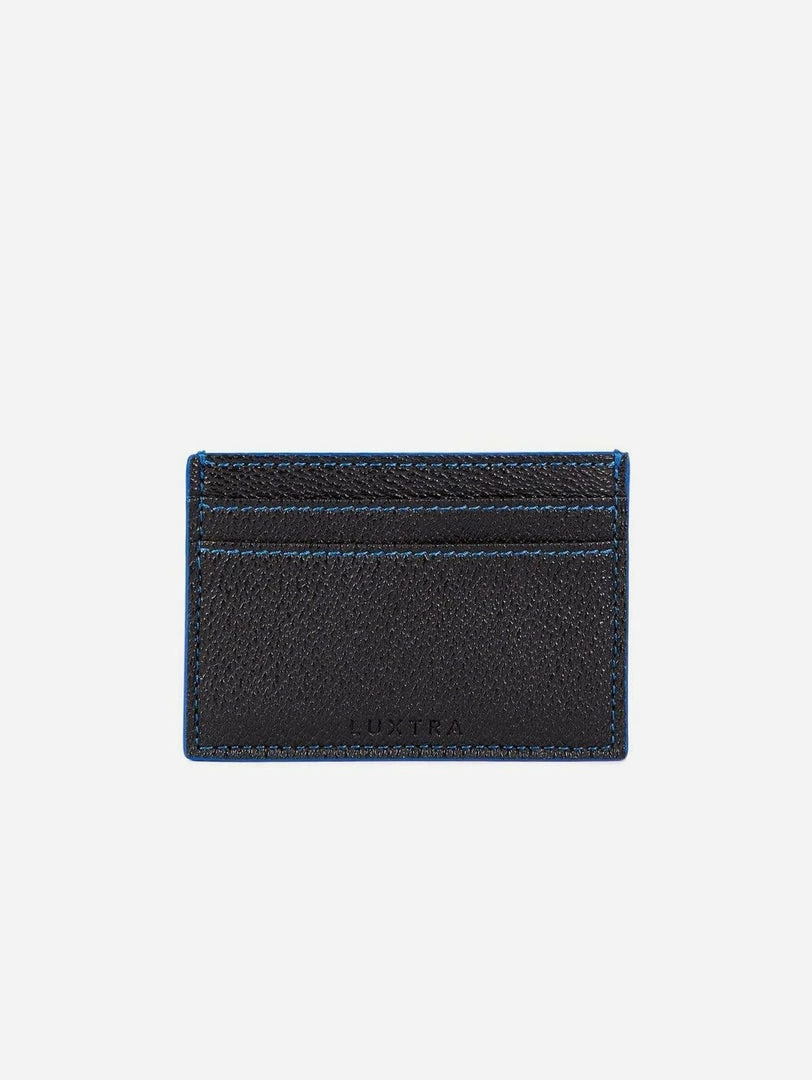 Black vegan leather card holder with contrasting electric blue edges and stitching. Accommodates four cards with a central slot for bills and receipts.Â