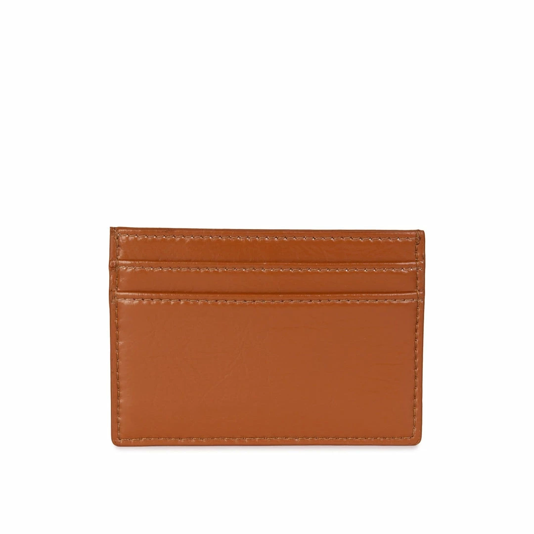 Tan vegan leather card holder. Accommodates four cards with a central slot for bills and receipts.