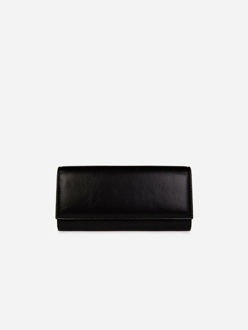 - Black vegan leather continental-style wallet with contrasting fuchsia pink interiorÂ