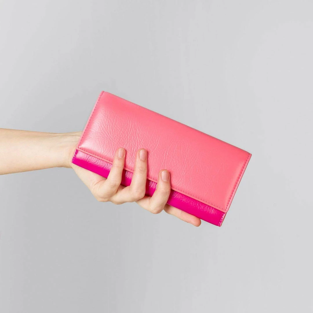 - Tricolour pink vegan leather continental-style wallet with contrasting red/orange yellow interior.