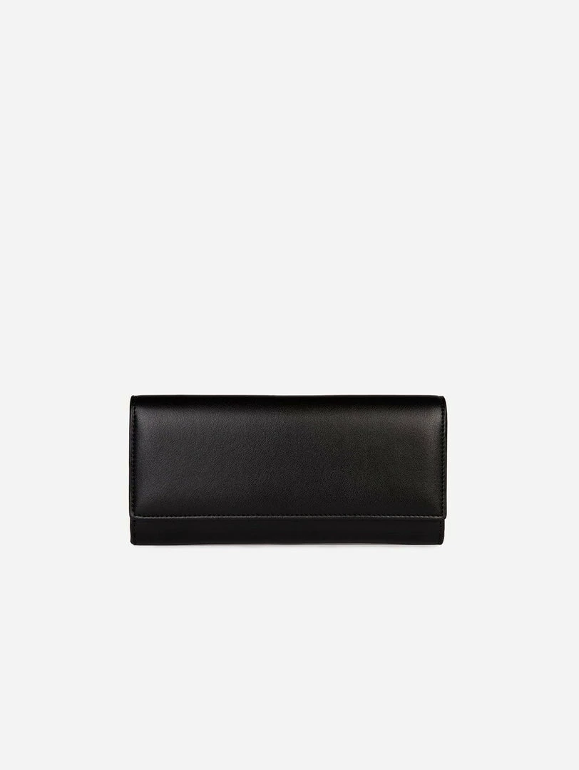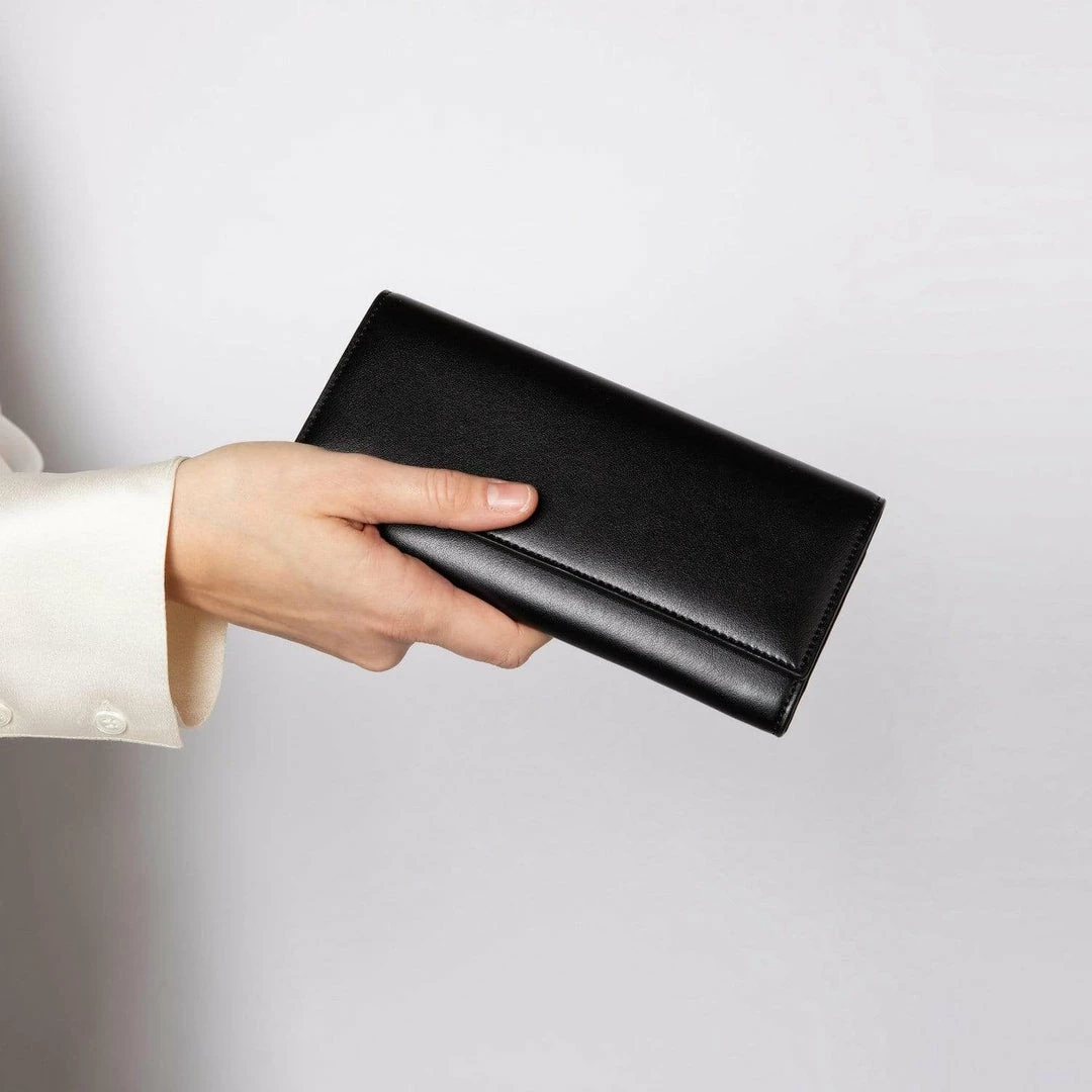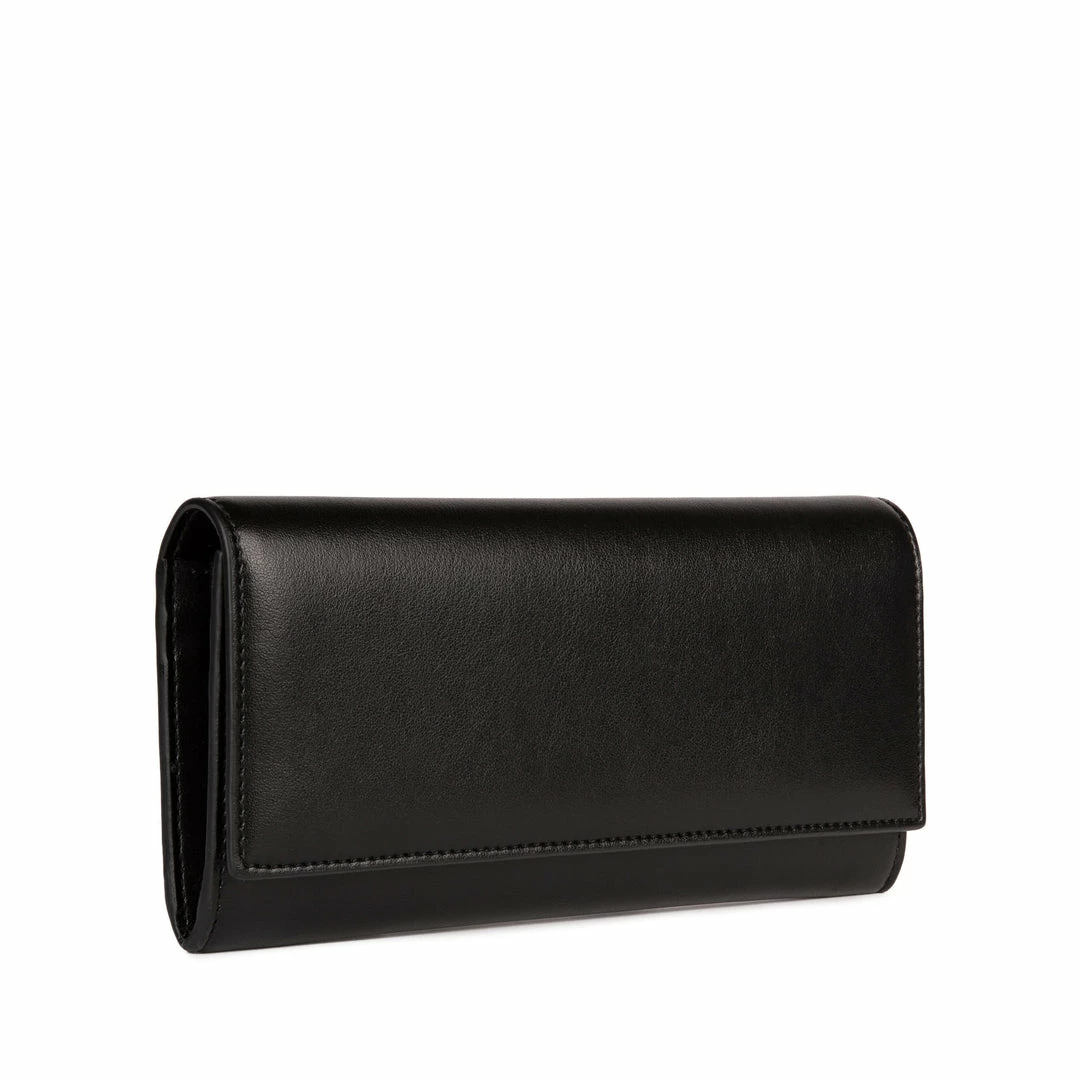 - Black continental-style wallet in a smooth luxury vegan leather
