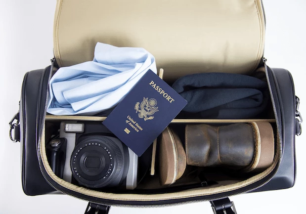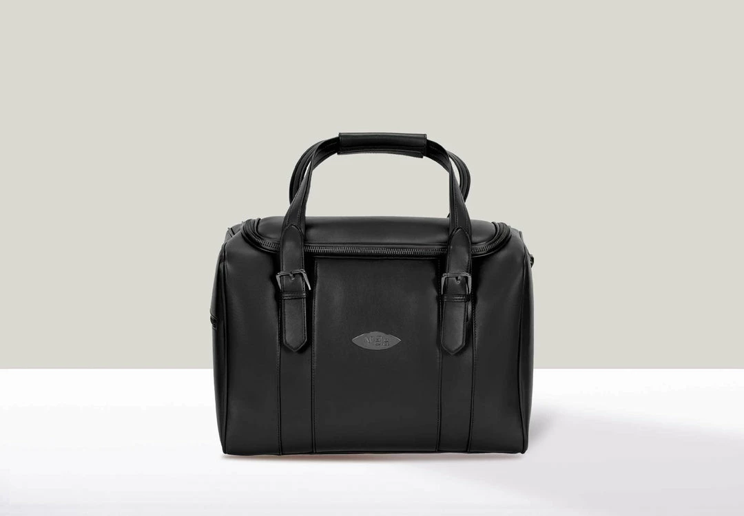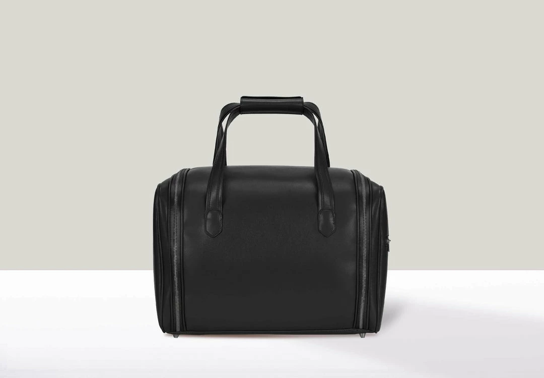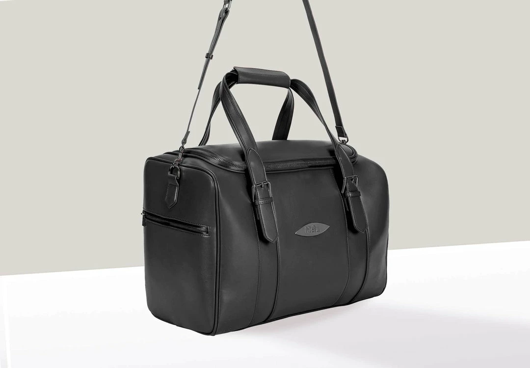 - Vegan leather duffel bag with adjustable, removable crossbody strap