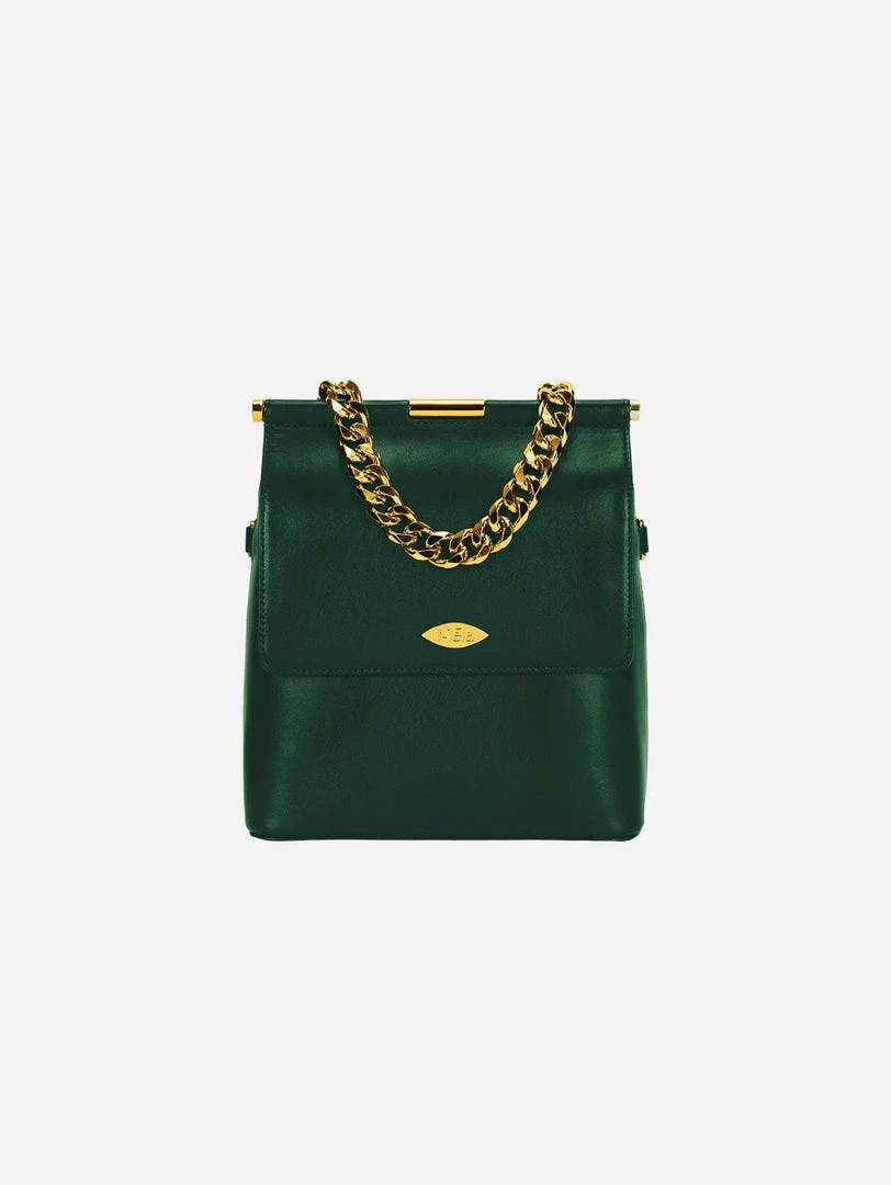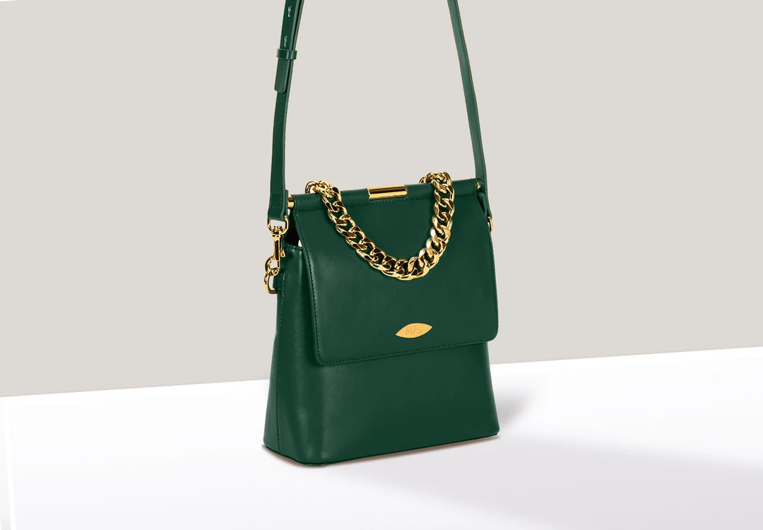 - Vegan leather crossbody bag with adjustable, removable strap and chain top handle