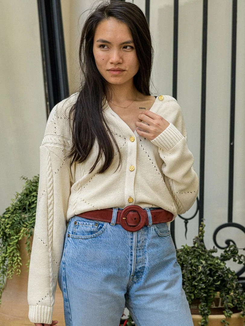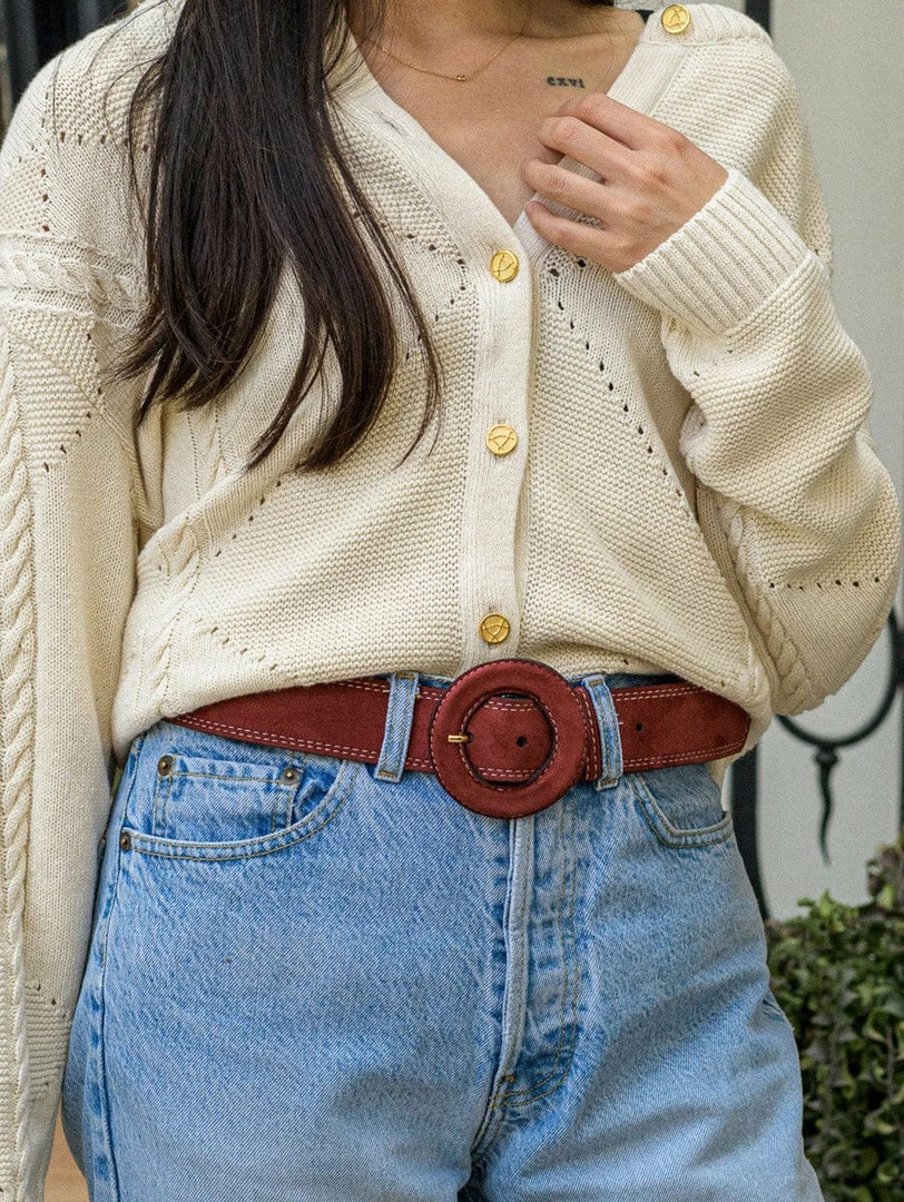 The deliciously vintage look of this Bohemian belt will have you waltzing all fall long! With its round buckle and stitching, it will bring the ultimate detail to your outfit.