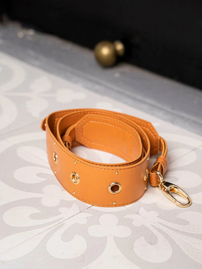 Give your everyday companion a twist with the gold eyelet strap, made with eco-friendly apple leather!