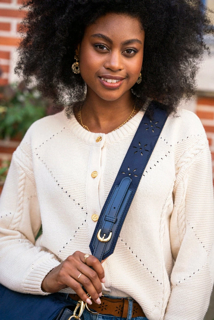 A soft and recycled material, a perforated and elegant pattern, some golden details… What more could you ask for to complete your outfit with a touch of style?