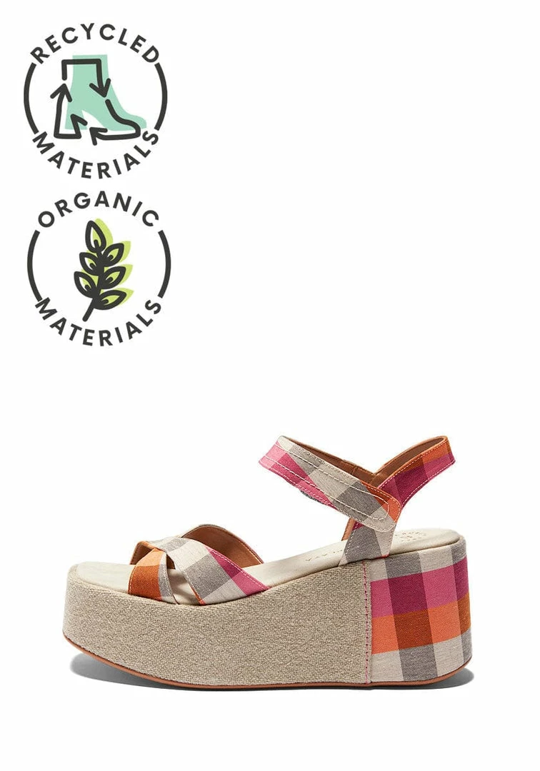 The Marta sandals are made with organic cotton and recycled materials such as linen, polyester and cotton. The platform is made of cork and the fabric that covers it is made from recycled linen.